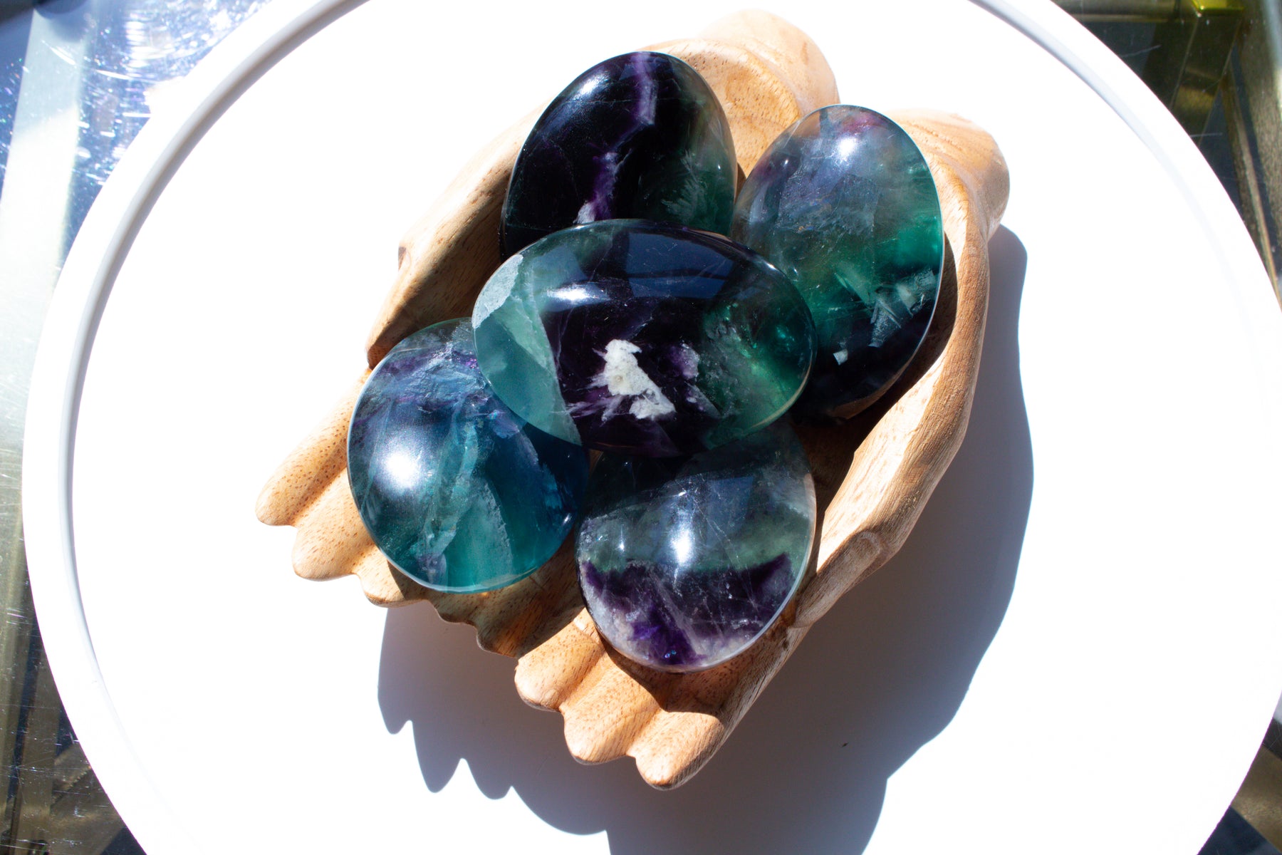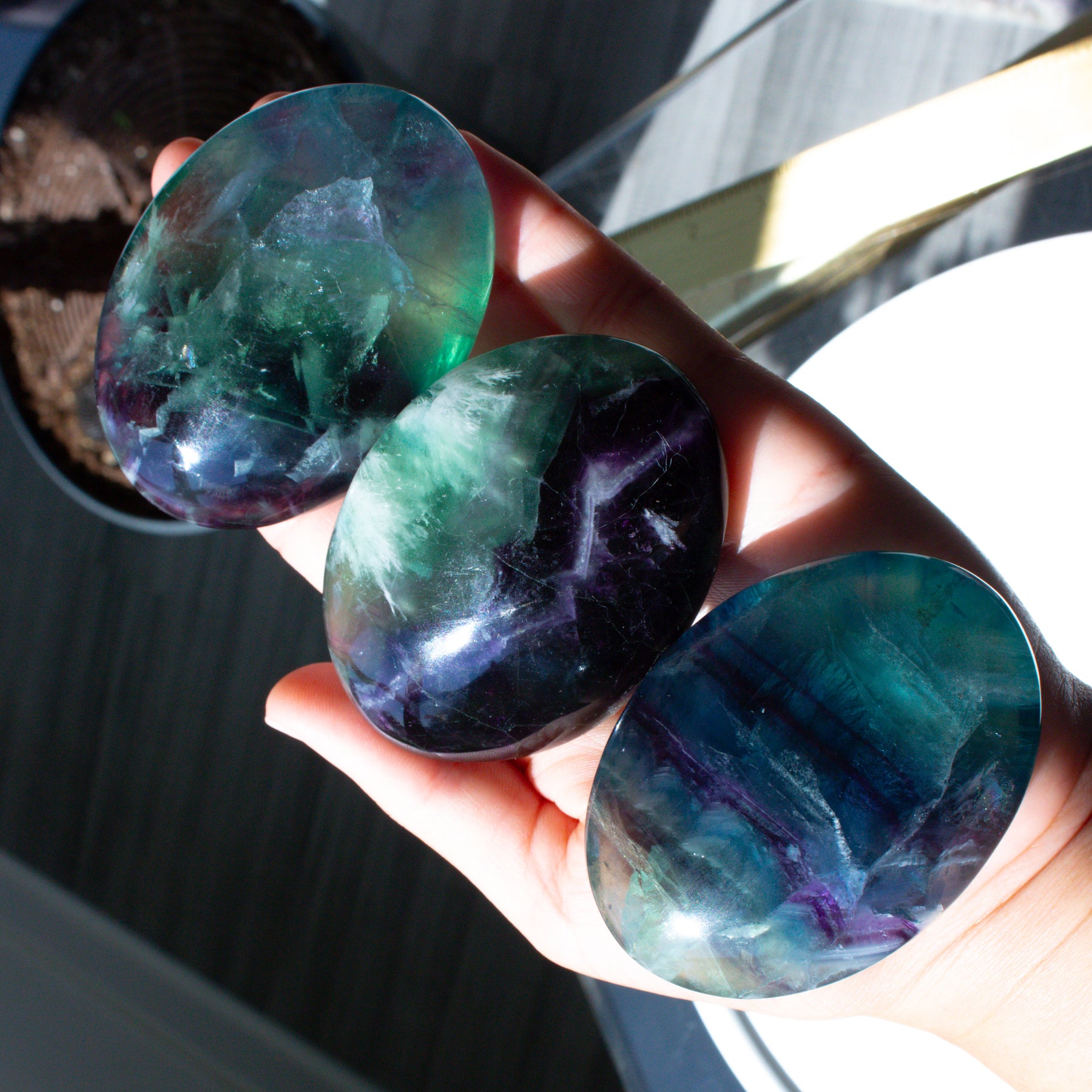 In addition to the generic healing properties of Fluorite, specific colors have additional attributes (Blue, Green, Purple).