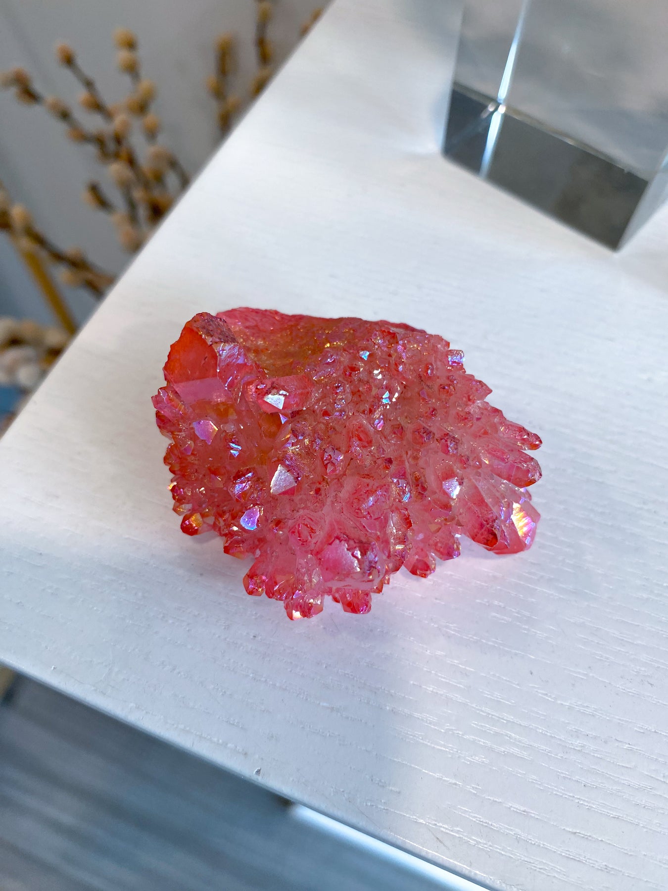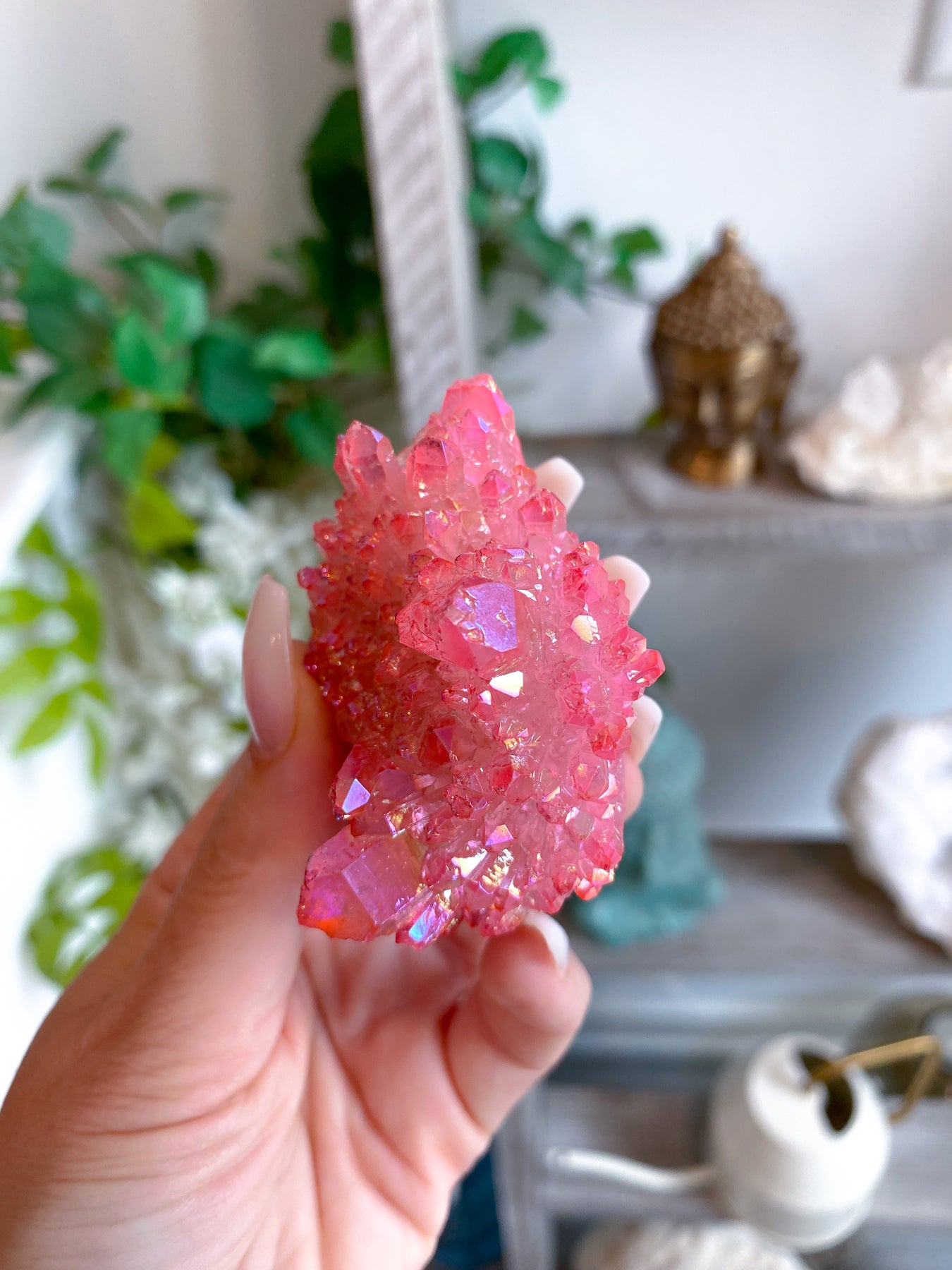 Angel Aura Quartzoffers a luminous doorway into higher vibrations. With its ethereal rainbow glow, this captivating quartz is created by infusing clear quartz with precious metals like platinum, giving it a shimmering, otherworldly finish.