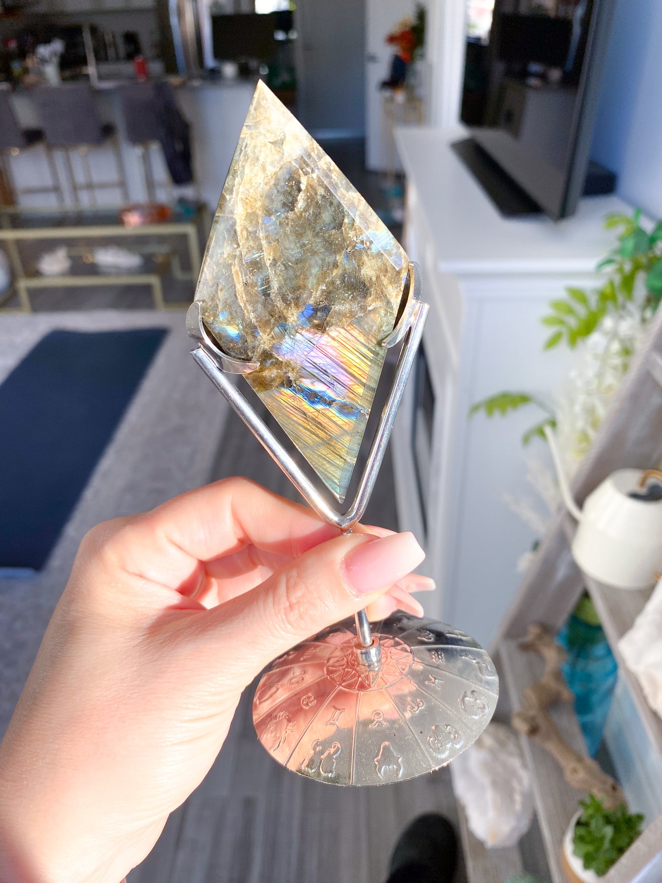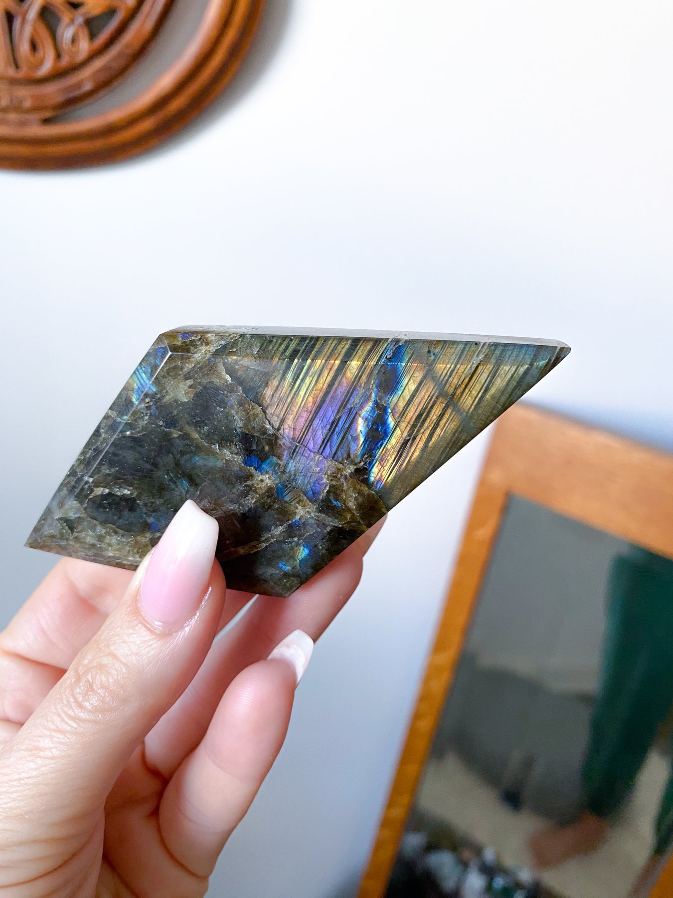 Labradorite’s transformative powers support us during times of change and personal evolution. Labradorite helps soothe fear, release insecurity, calm the mind, and promote strength and perseverance. It can lift your mood, strengthen intuition, and even balance and protect your aura. Working with this stone will enhance your psychic abilities by elevating your intuition, raising your consciousness and deepening your connection to spiritual energies. A gateway to new ideas, Labradorite stimulates imagination and is known to reveal the truth behind illusions. Because of these benefits, this iridescent stone truly builds trust in the self and in the Universe.