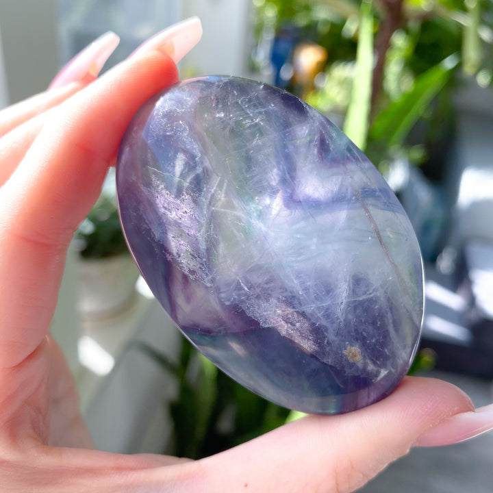 In addition to the generic healing properties of Fluorite, specific colors have additional attributes (Blue, Green, Purple).