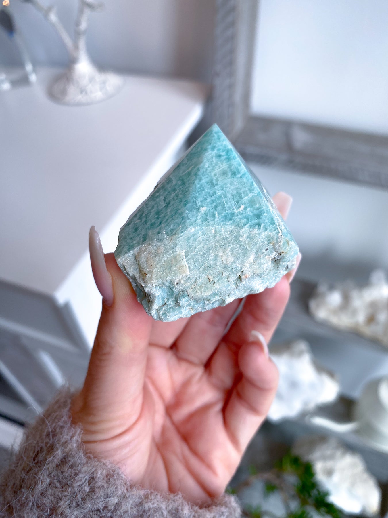 Amazonite, one of the most soothing stones, brings harmony and balance to masculine and feminine energies. By opening the throat chakra, Amazonite assists us when we need to express our emotions without clouding our real intentions, or set boundaries with those close to us. Connected to the heart chakra, Amazonite calls in universal love, alleviates loneliness and can help a rocky marriage or union get through difficult times. It helps us see both sides of the story, and will tame any irrational thoughts, fears or worries by providing us courage and truth. It moves us to live our values with integrity. A stone of prosperity, this stone attracts business opportunities, and arranges luck in our favor. Sleeping with an Amazonite can help us solve problems in our sleep through symbolism in our dreams.