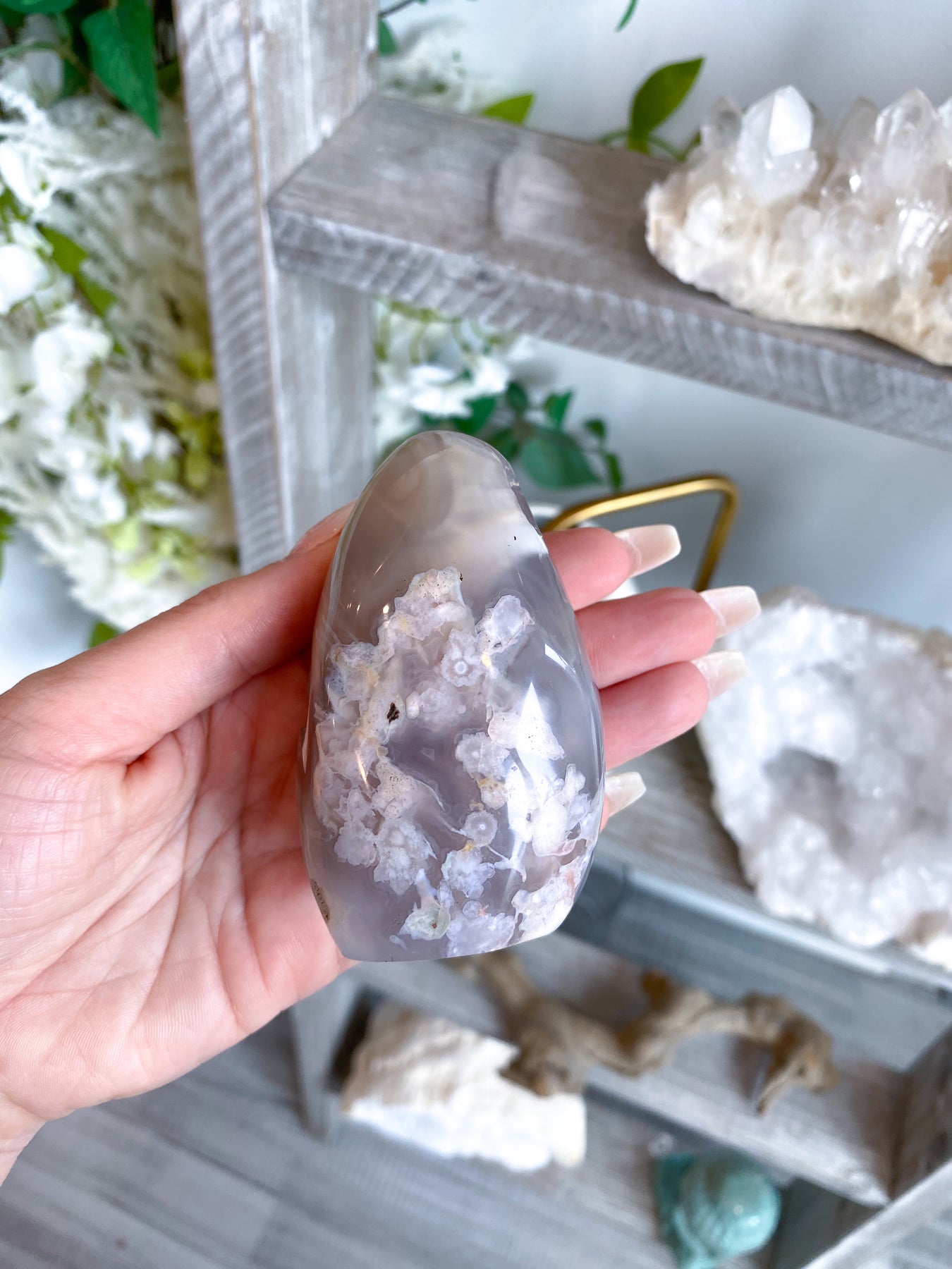 - Flower Agate Coloration- Red, Green, white, grey, brown, pink, clear with flower like formations Chakras- Root, Heart