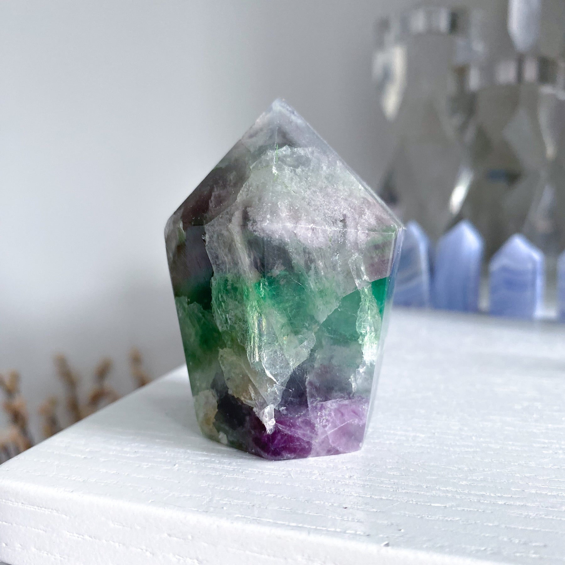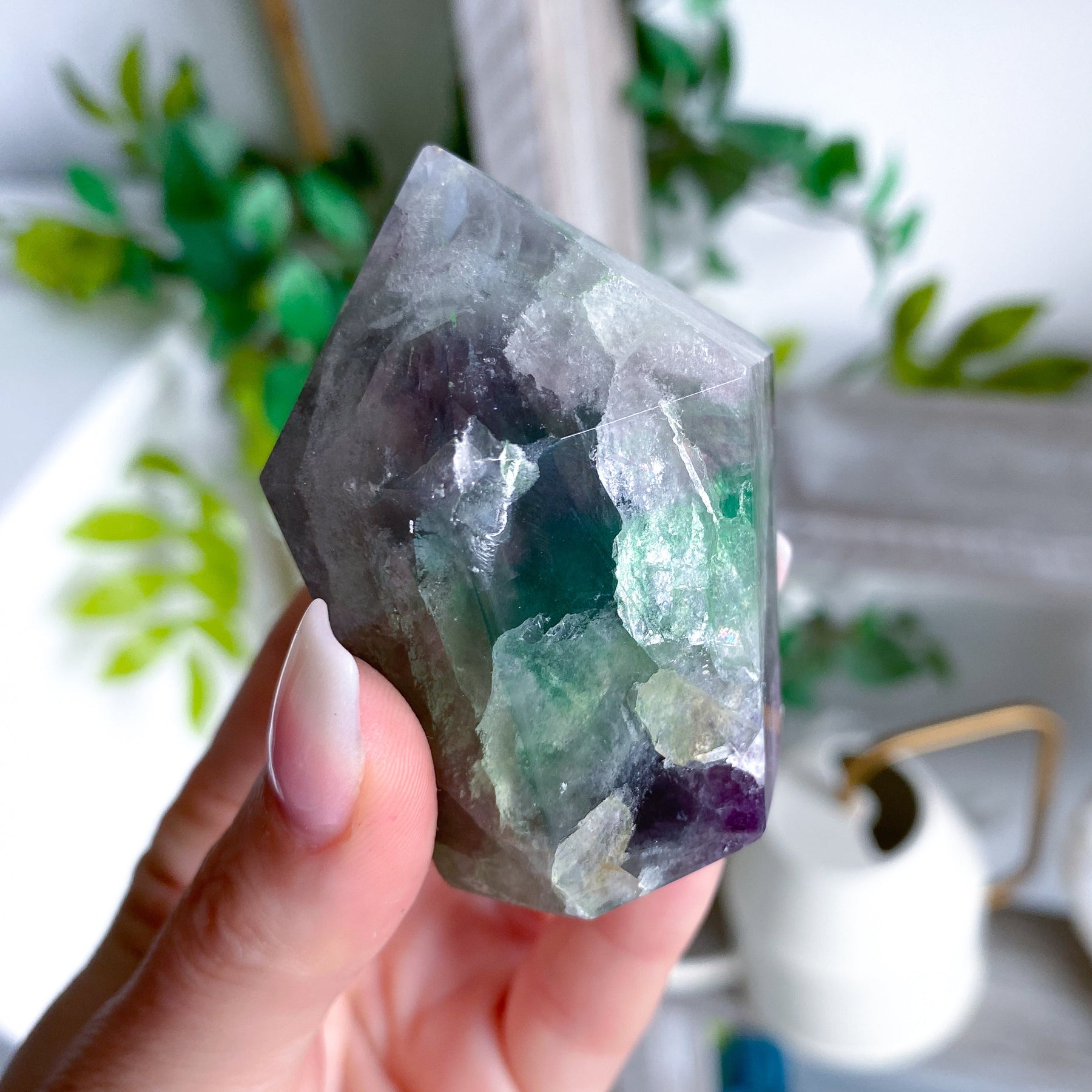 In addition to the generic healing properties of Fluorite, specific colors have additional attributes (Blue, Green, Purple).
