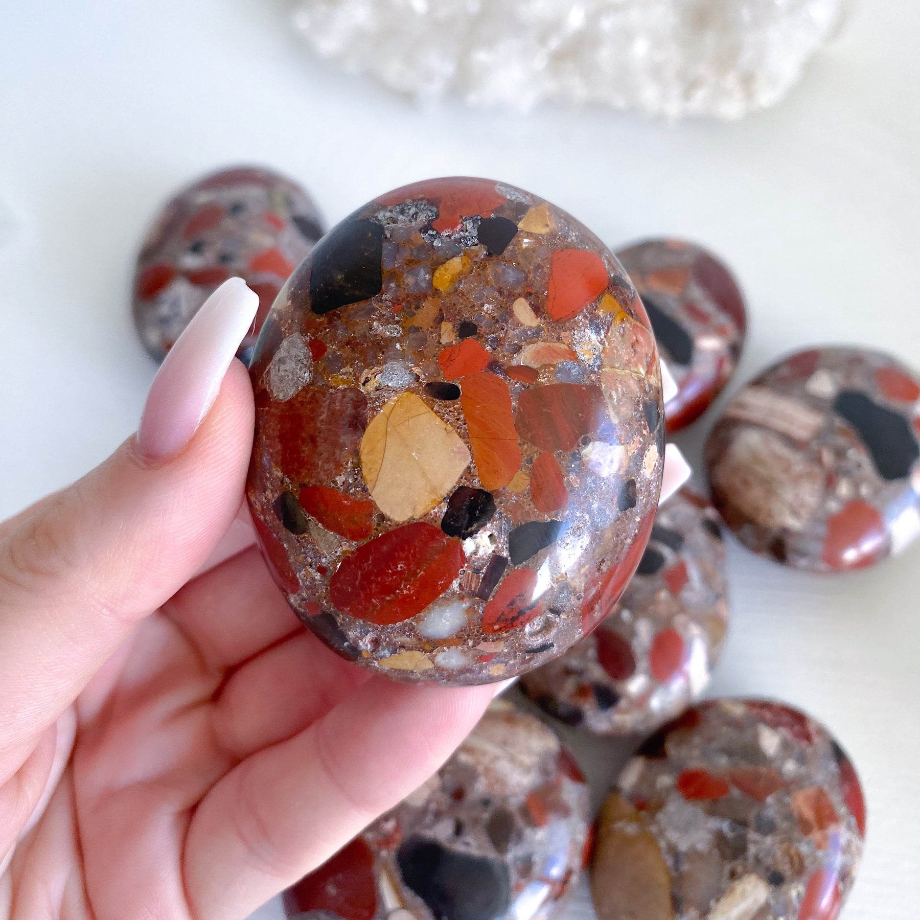 Receive on per order, Conglomerate Jasper palm stone. Some have texture. Approx 2"x1.5"
