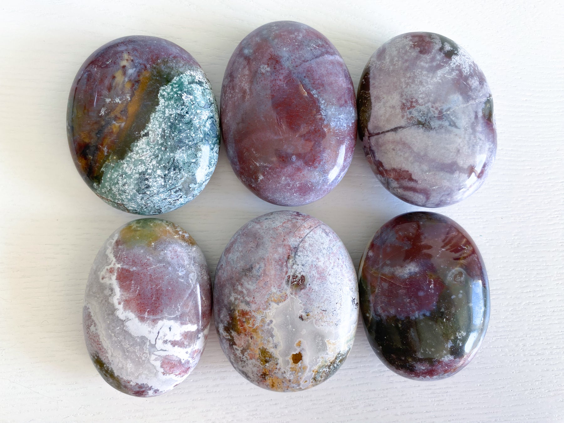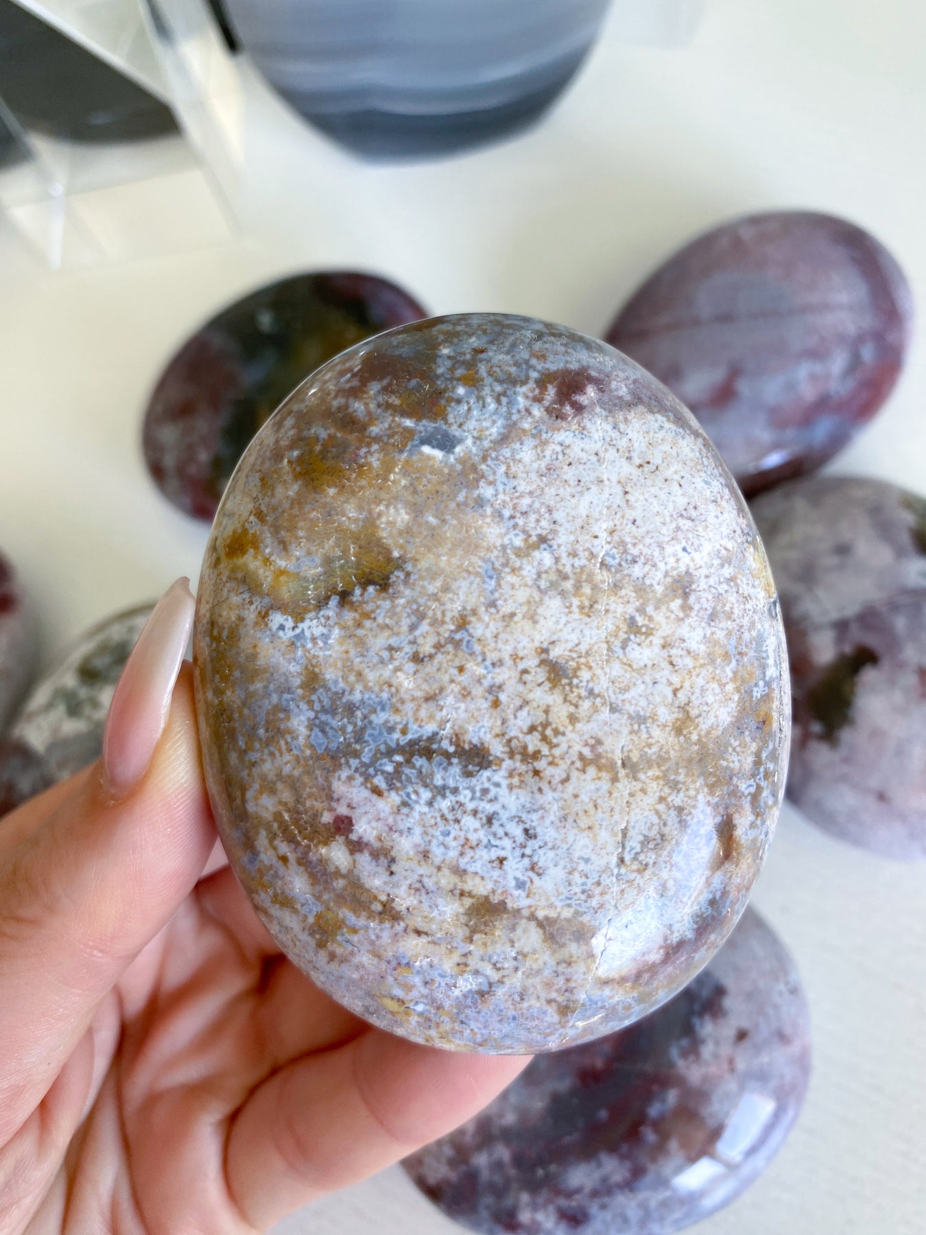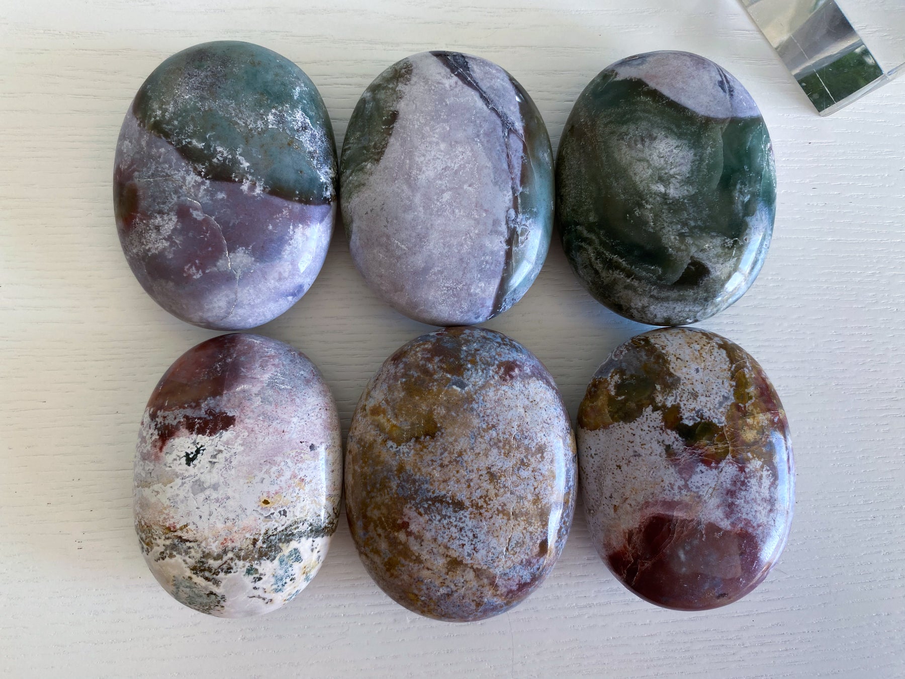 Whats the difference from Ocean Jasper? OJ often contains inclusions of other minerals like feldspar or druzy quartz, creating its characteristic orb-like patterns. Unicorn Jasper's colorful patterns are typically due to mineral impurities like iron or manganese, giving it a unique palette and whimsical appearance.