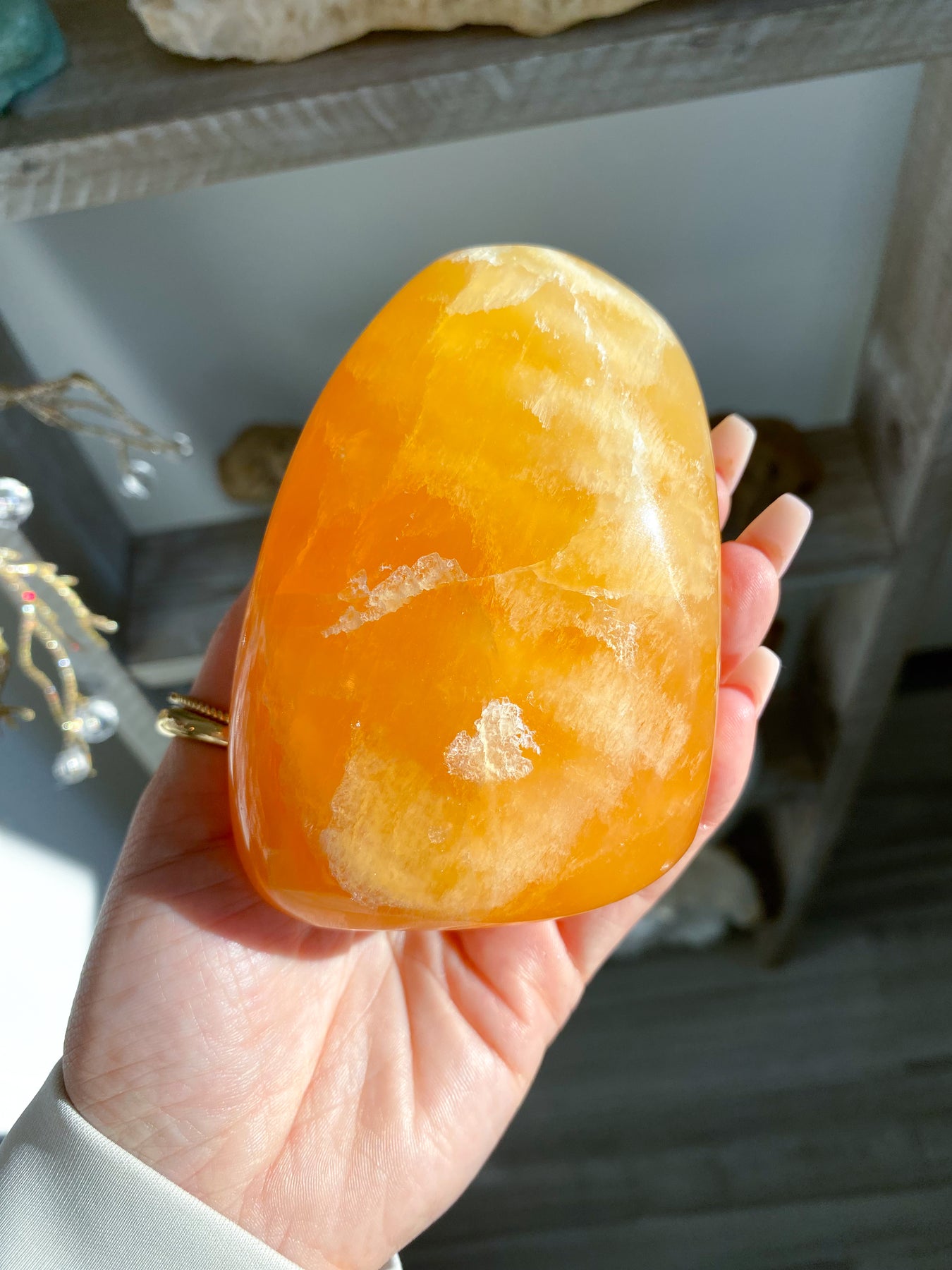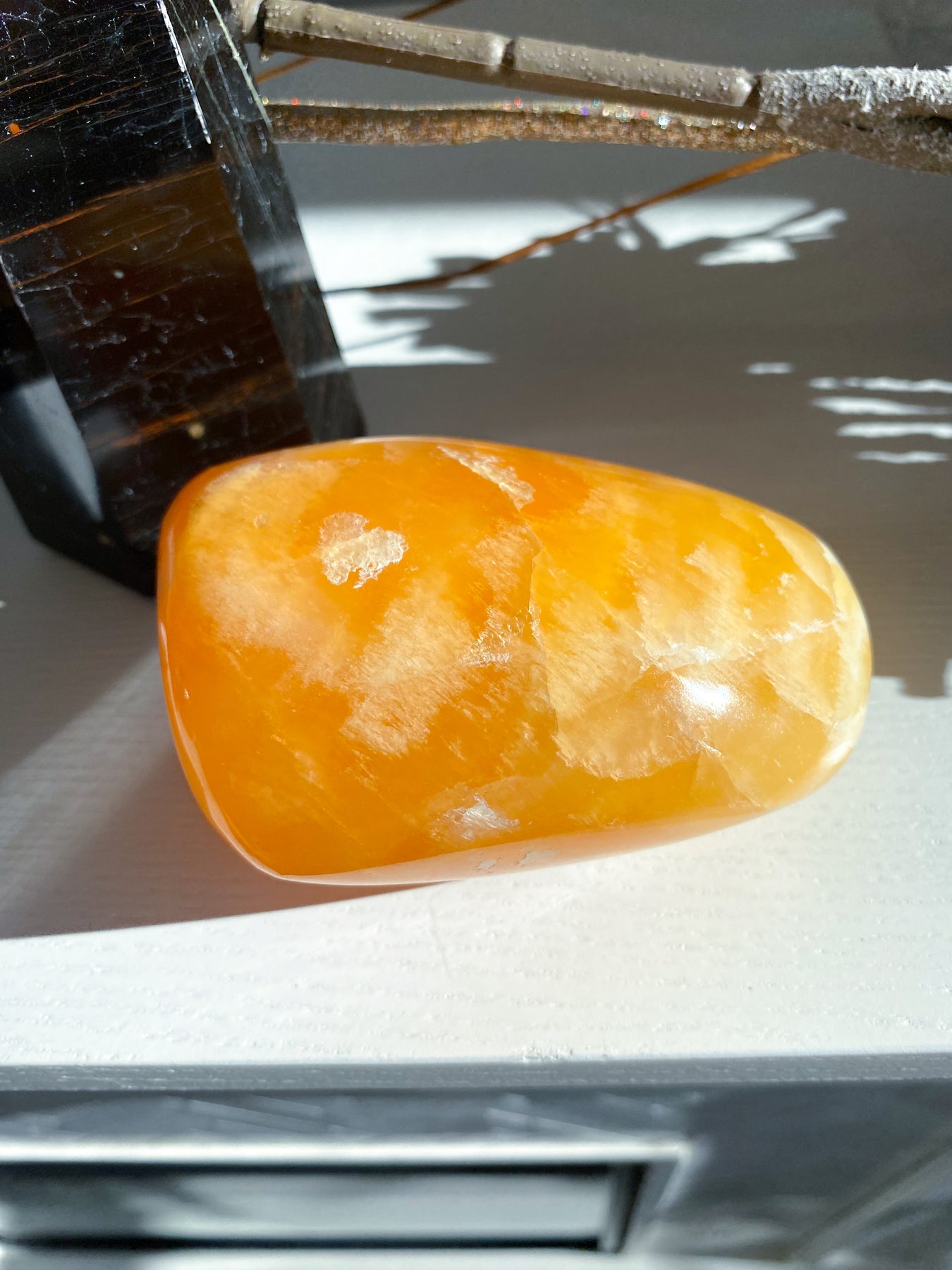 An Orange Calcite Stone is a strong sacral chakra stone that gets the positive energy moving, especially in the areas of creativity and sexuality. It has very strong energizing and cleansing properties, like all calcite. The orange calcite meaning is ideal for those who are looking for new and innovative ideas or solutions to ongoing problems. It gets the energy moving, encouraging you to look at things in a different light. Orange Calcite stones encourage playfulness, lightheartedness and confidence. It is a catalyst for inspiration, sparking your creative fire. The orange calcite healing properties are powered by the Sun, and are very energizing and healing. An orange calcite stone is a wonderful healing stone for anyone trying to break out of old patterns or overcome shyness.