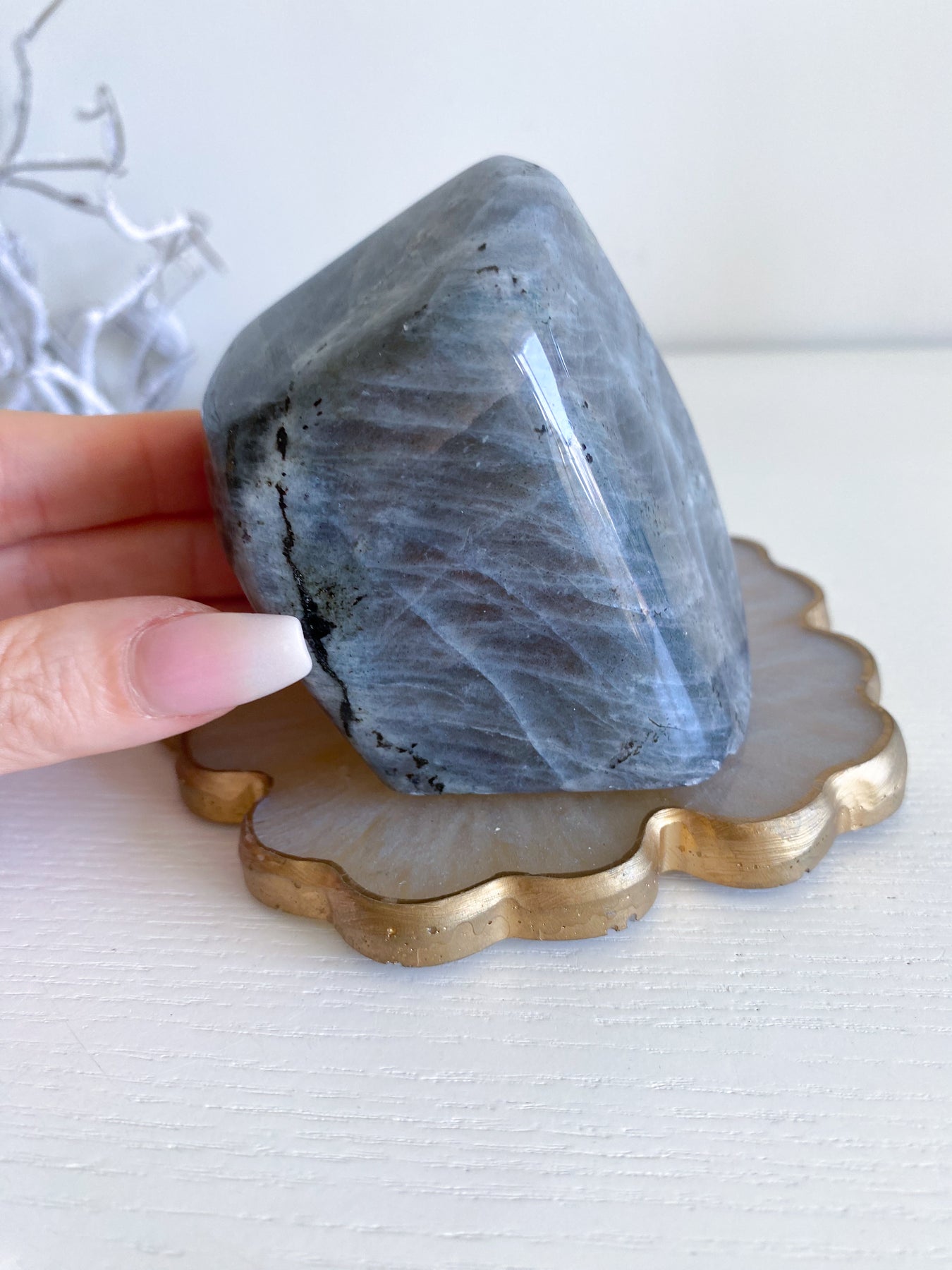 Labradorite’s transformative powers support us during times of change and personal evolution. Labradorite helps soothe fear, release insecurity, calm the mind, and promote strength and perseverance. It can lift your mood, strengthen intuition, and even balance and protect your aura. Working with this stone will enhance your psychic abilities by elevating your intuition, raising your consciousness and deepening your connection to spiritual energies. A gateway to new ideas, Labradorite stimulates imagination and is known to reveal the truth behind illusions. Because of these benefits, this iridescent stone truly builds trust in the self and in the Universe.