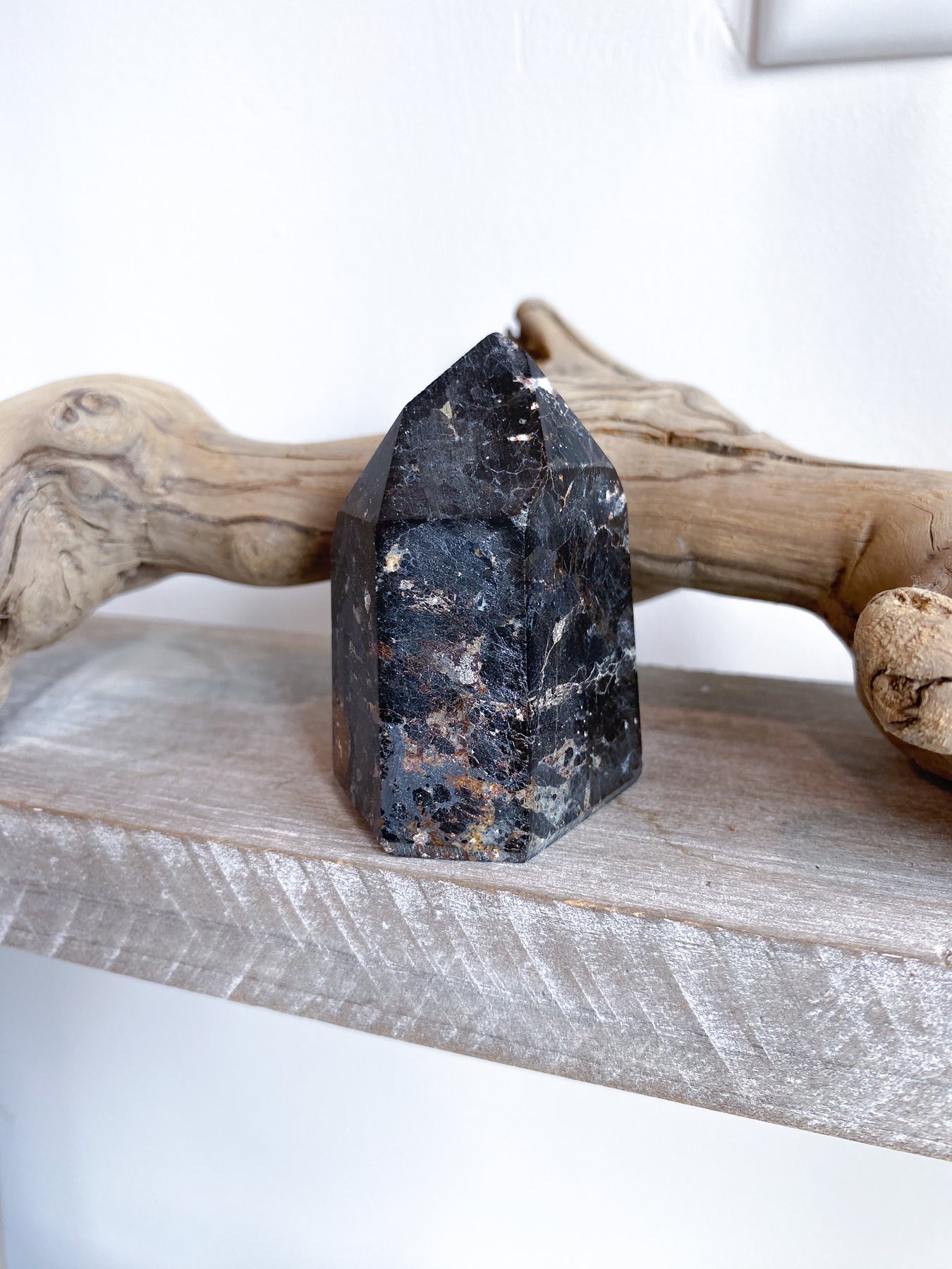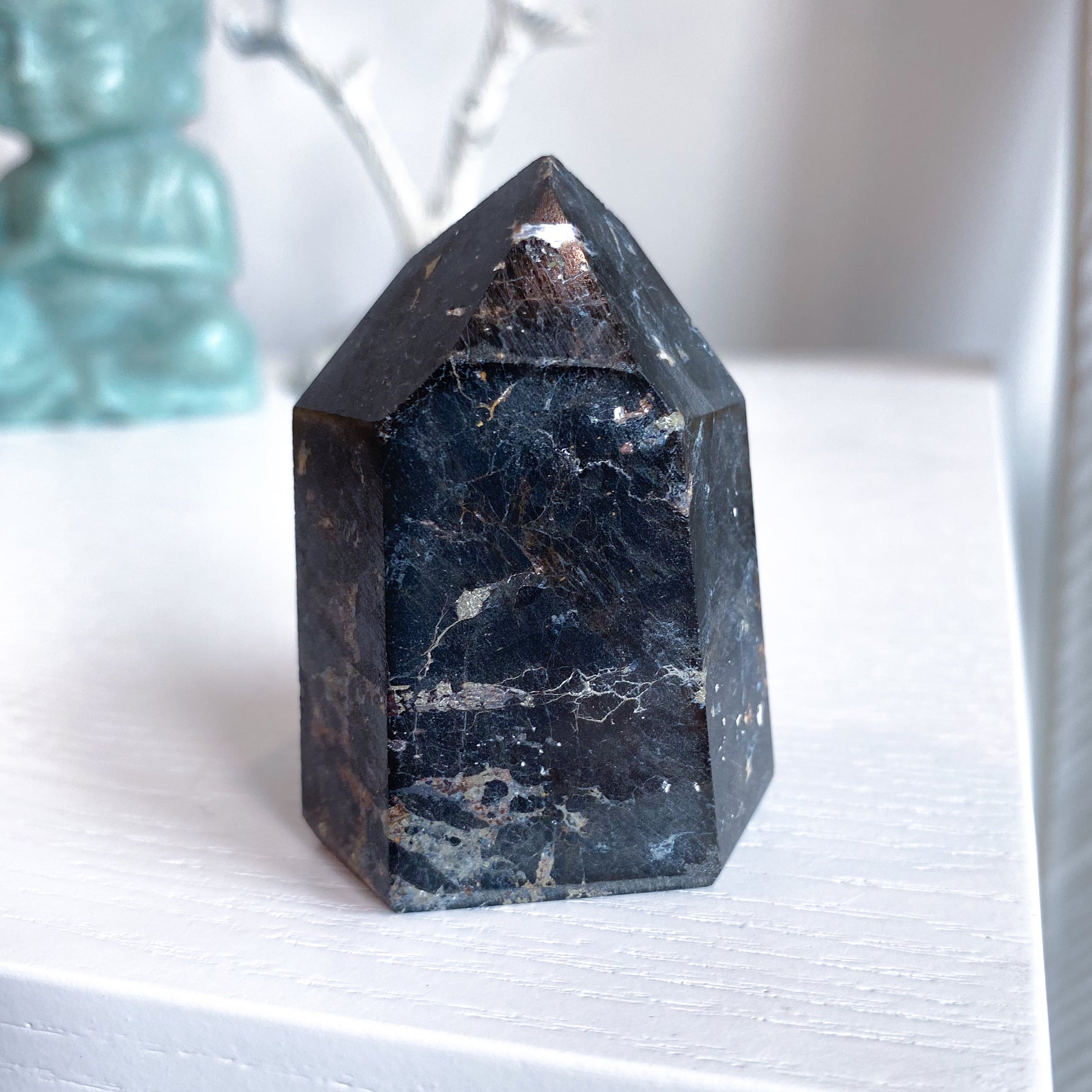 The inky, beautiful Black Tourmaline creates a field of protection by absorbing negativity, cleansing your auric field of harmful energies directed at you. Because of this, the stone aids self-confidence, diminishes fear, enhances energy, promotes internal peace and removes blockages. It also balances male/female, yin/yang energy within the body, including the right-left sides of the brain. Black Tourmaline provides grounding and can assist in swapping bad habits for positive ones. Tourmaline has many colors, but the darker than night black variety gets its color from the iron it contains.