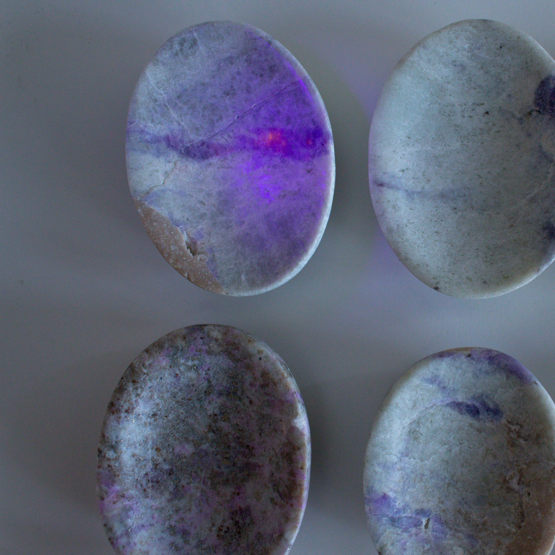 Hackmanite is UV-reactive and has tenebrescence. Under ultraviolet light, it reveals hidden colors, which mirrors its energy in your life: subtle shifts that lead to deeper transformation, often in ways you didn’t expect. Under the sun, Hackmanite shifts colors (tenebrescence).