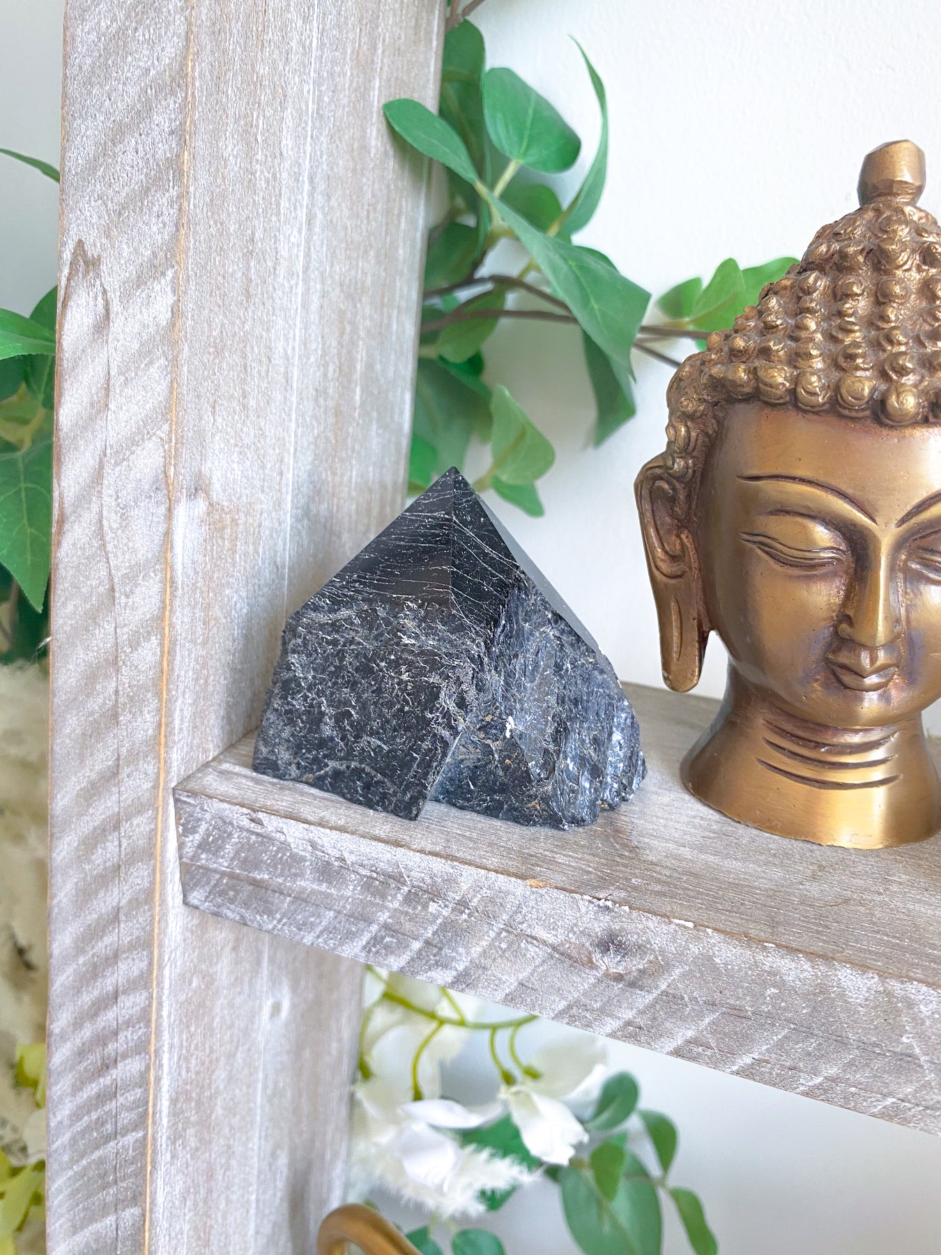 The inky, beautiful Black Tourmaline creates a field of protection by absorbing negativity, cleansing your auric field of harmful energies directed at you. Because of this, the stone aids self-confidence, diminishes fear, enhances energy, promotes internal peace and removes blockages. It also balances male/female, yin/yang energy within the body, including the right-left sides of the brain. Black Tourmaline provides grounding and can assist in swapping bad habits for positive ones. Tourmaline has many colors, but the darker than night black variety gets its color from the iron it contains.