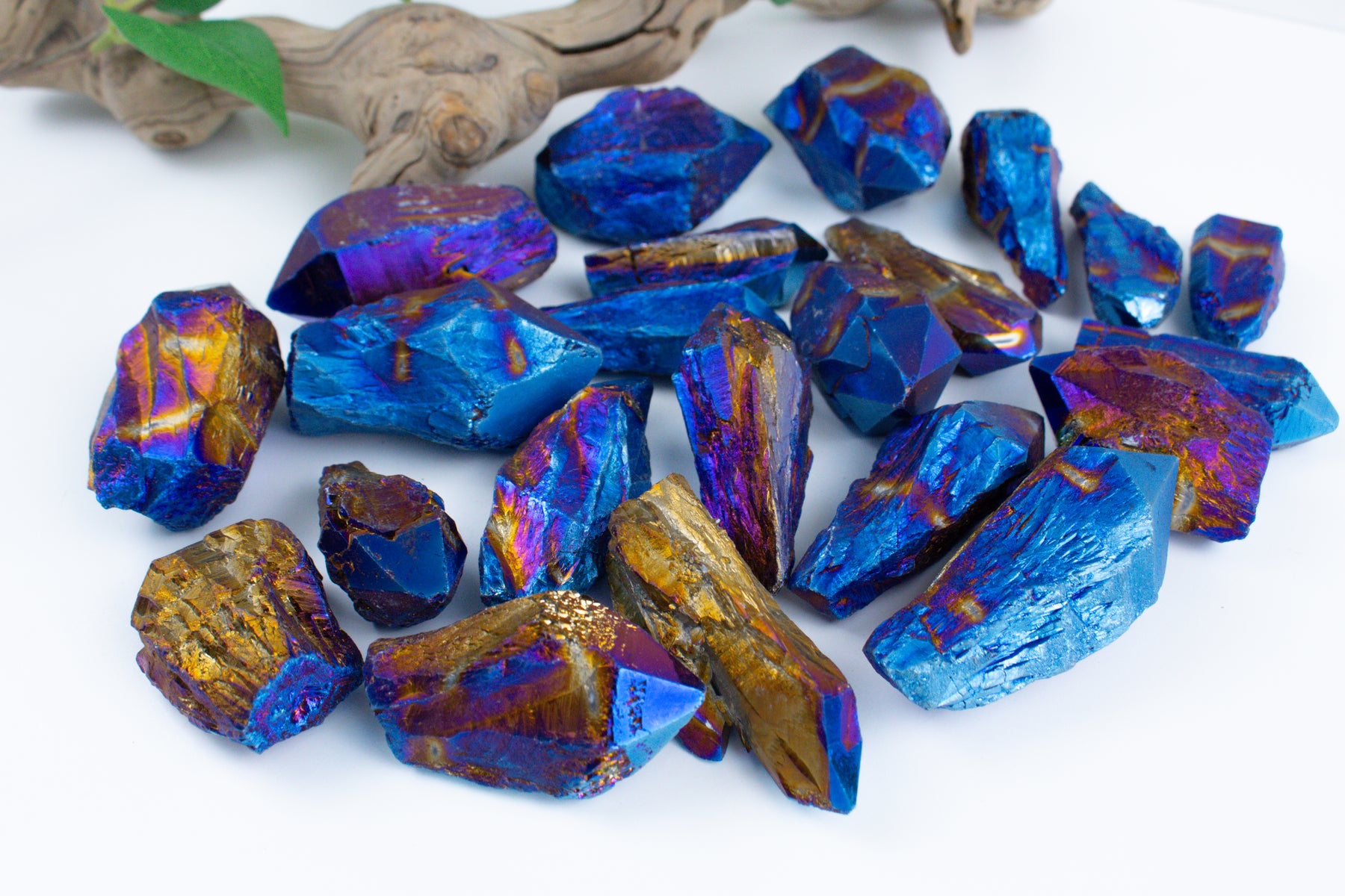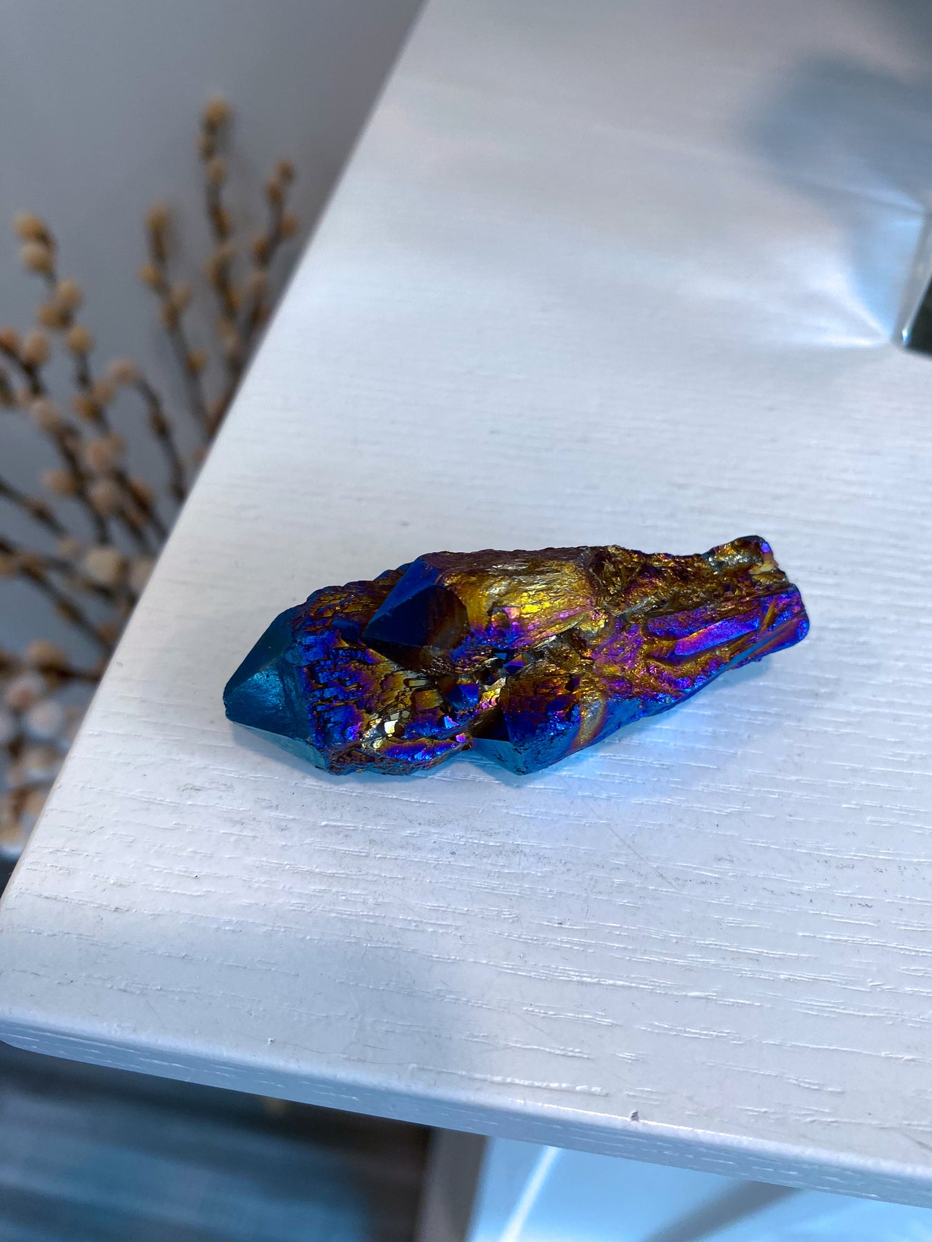 Blue titanium aura quartz is a mesmerizing crystal that results from a fusion of titanium and other metals onto clear quartz. This process creates a beautiful range of blue hues with a metallic iridescence, giving the crystal a striking appearance. Blue titanium aura quartz is often revered for its ability to stimulate the throat chakra, promoting clear and honest communication. It is also believed to possess calming energies that aid in alleviating stress and enhancing one's ability to express themselves with authenticity. Many individuals use this crystal in meditation or spiritual practices to deepen their connection with inner truths and promote a sense of tranquility.