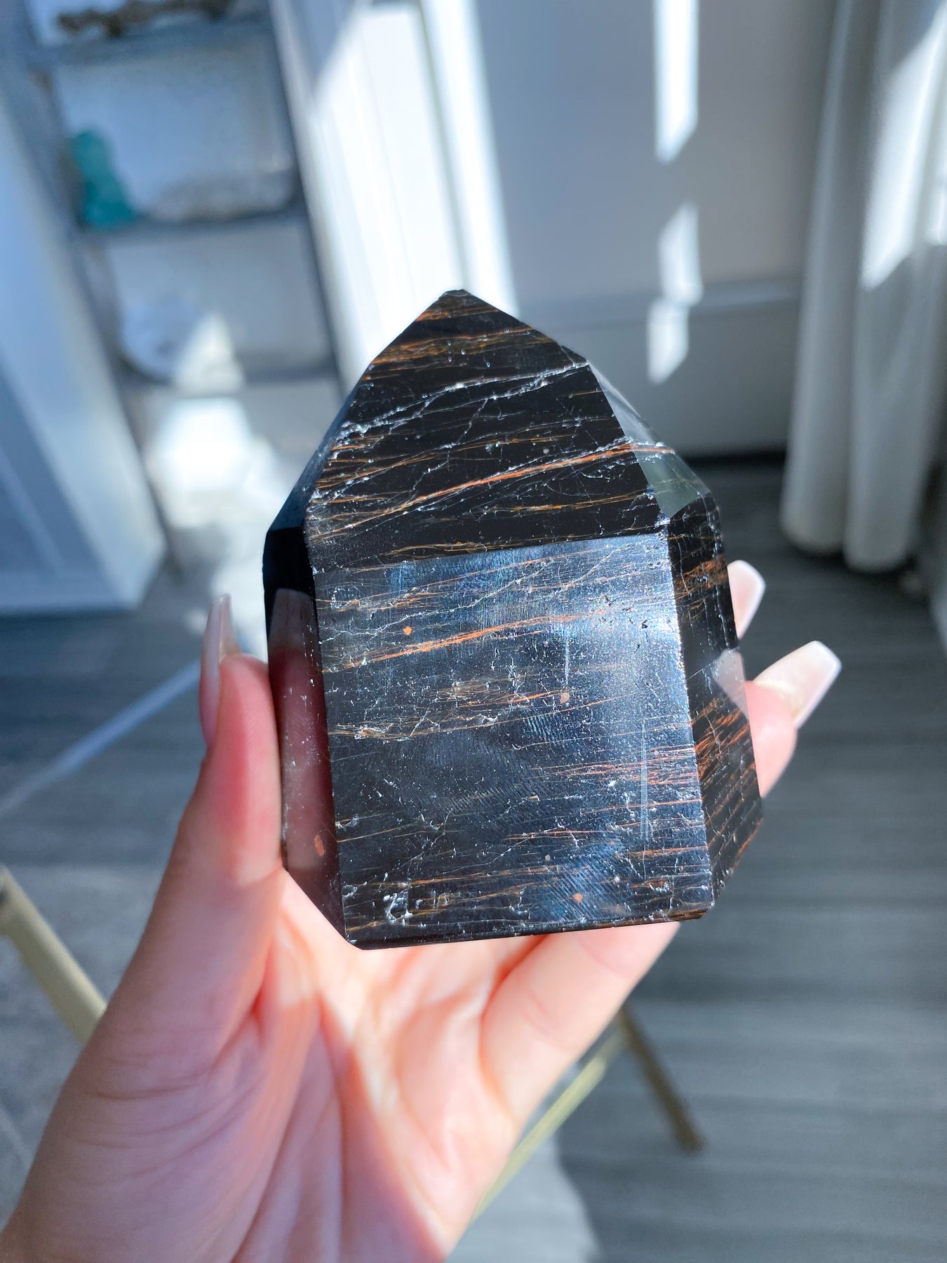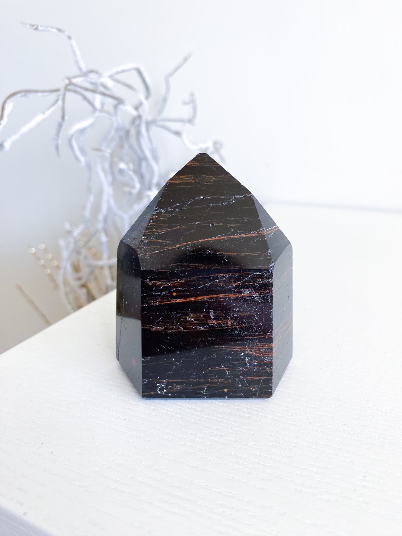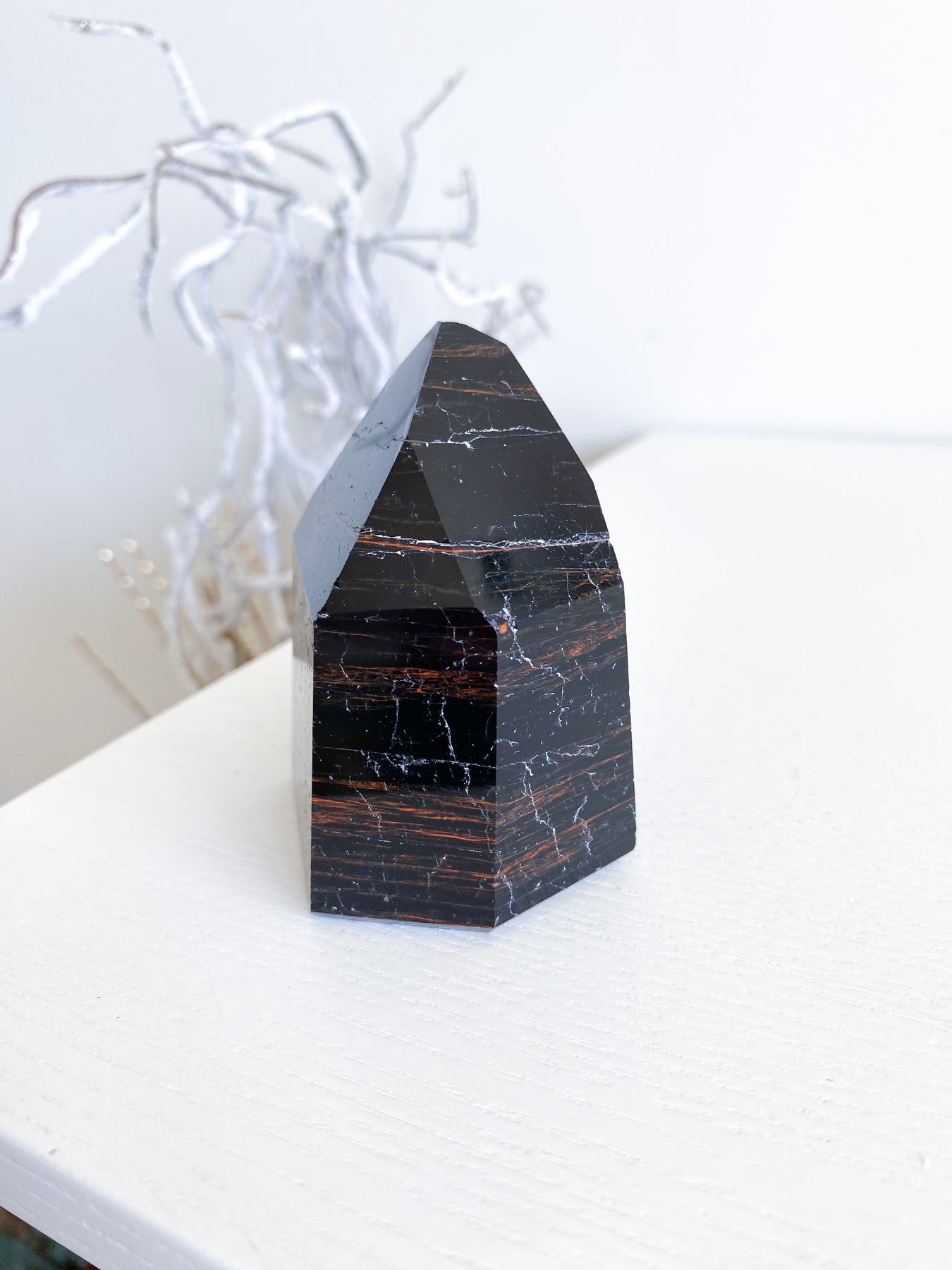 The inky, beautiful Black Tourmaline creates a field of protection by absorbing negativity, cleansing your auric field of harmful energies directed at you. Because of this, the stone aids self-confidence, diminishes fear, enhances energy, promotes internal peace and removes blockages. It also balances male/female, yin/yang energy within the body, including the right-left sides of the brain. Black Tourmaline provides grounding and can assist in swapping bad habits for positive ones. Tourmaline has many colors, but the darker than night black variety gets its color from the iron it contains.