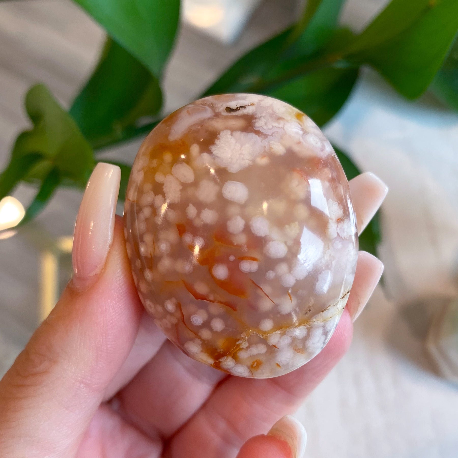 Flower agate palm stone, one of a kind! Has small natural occuring holes, not completely smooth.