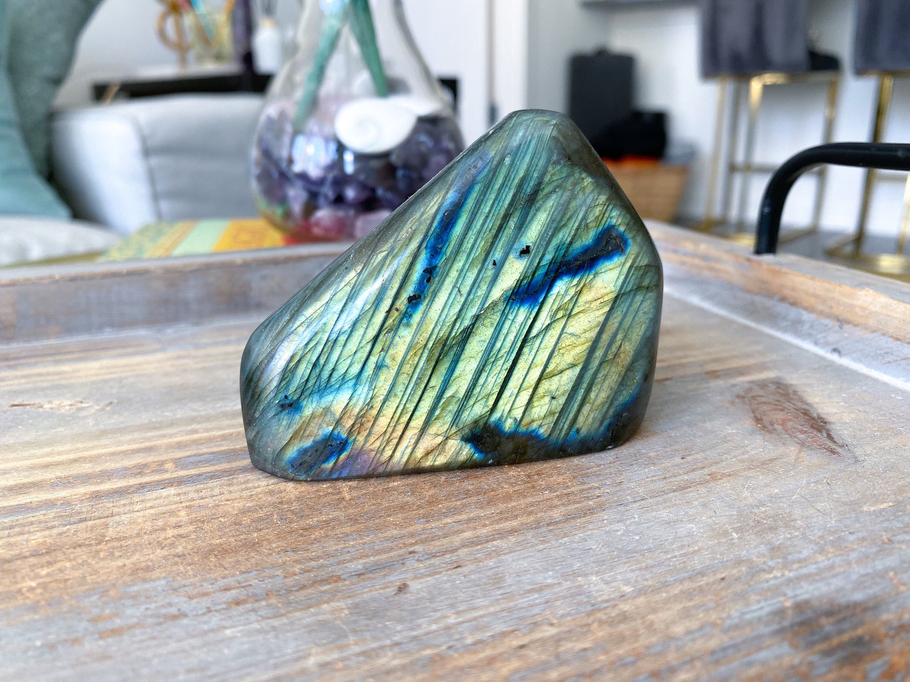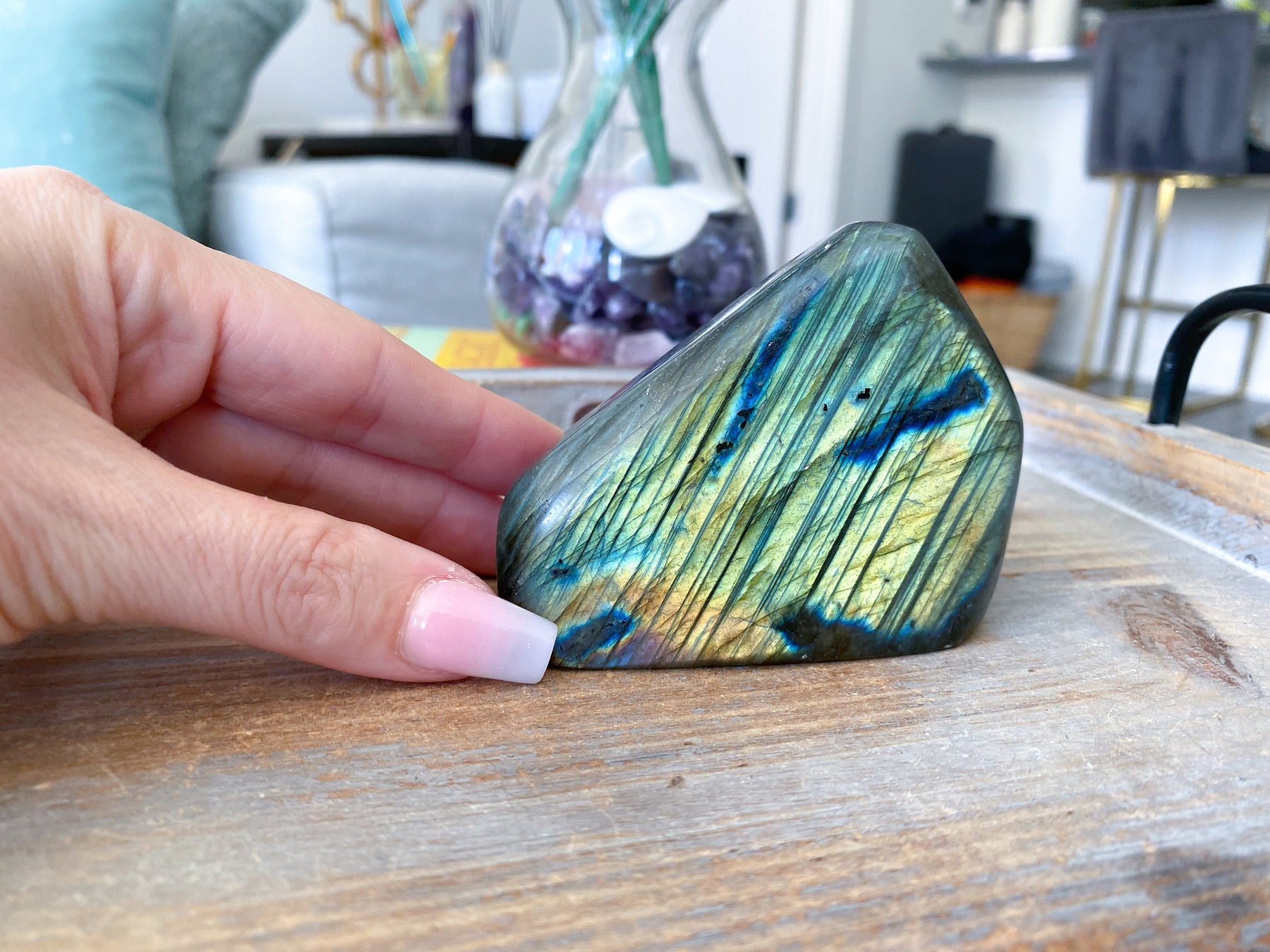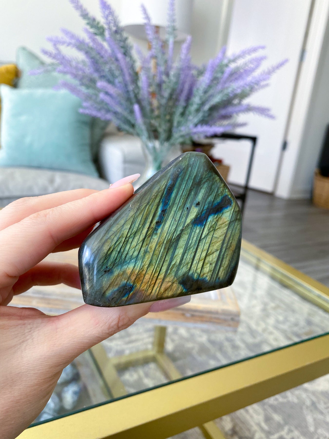 Labradorite’s transformative powers support us during times of change and personal evolution. Labradorite helps soothe fear, release insecurity, calm the mind, and promote strength and perseverance. It can lift your mood, strengthen intuition, and even balance and protect your aura. Working with this stone will enhance your psychic abilities by elevating your intuition, raising your consciousness and deepening your connection to spiritual energies. A gateway to new ideas, Labradorite stimulates imagination and is known to reveal the truth behind illusions. Because of these benefits, this iridescent stone truly builds trust in the self and in the Universe.