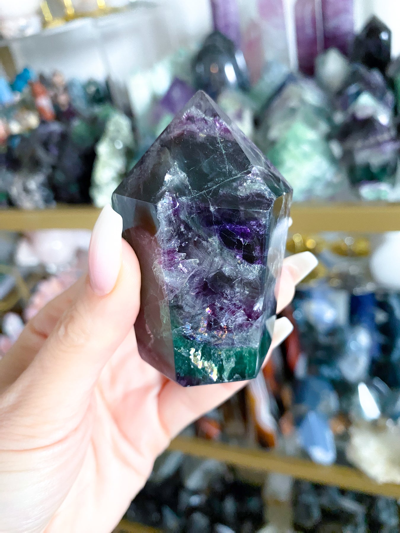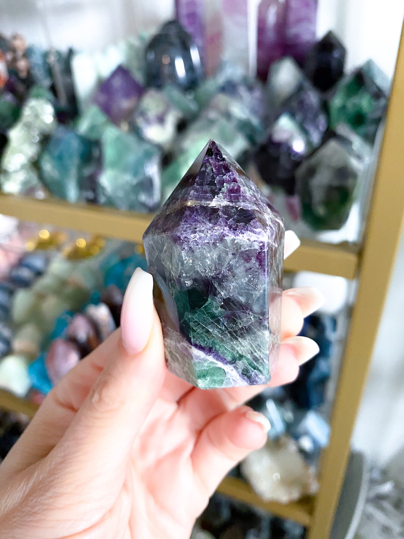 In addition to the generic healing properties of Fluorite, specific colors have additional attributes (Blue, Green, Purple).