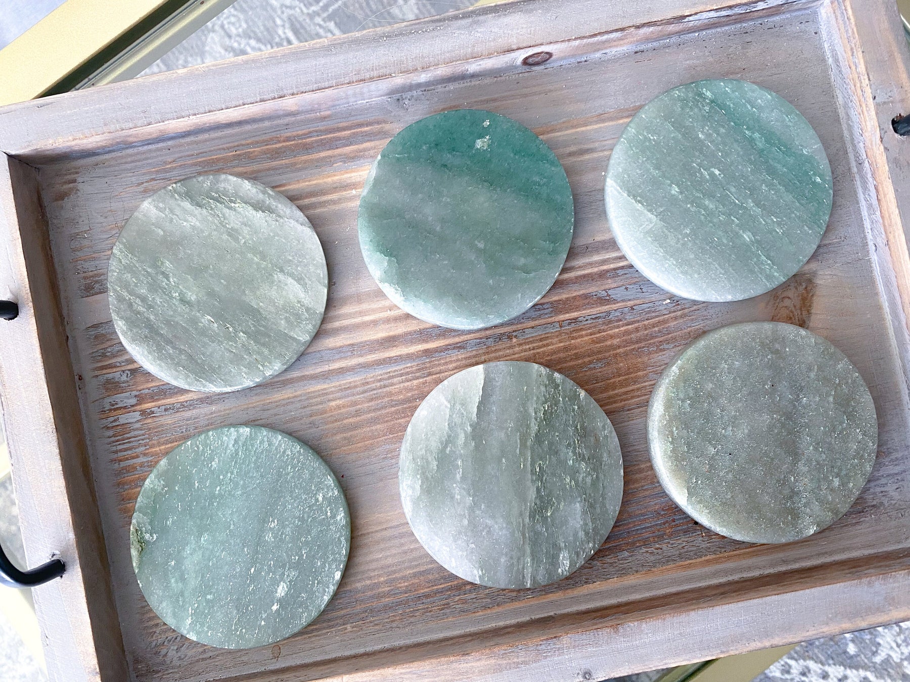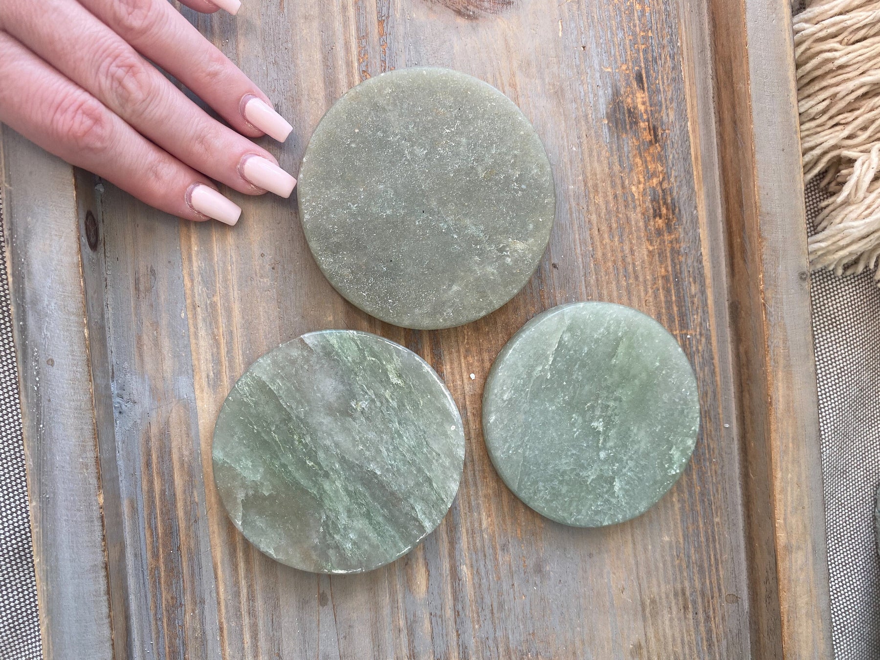 Listing is for ONE circular light green aventurine disk/coaster/charger, approx 2.75" wide each.