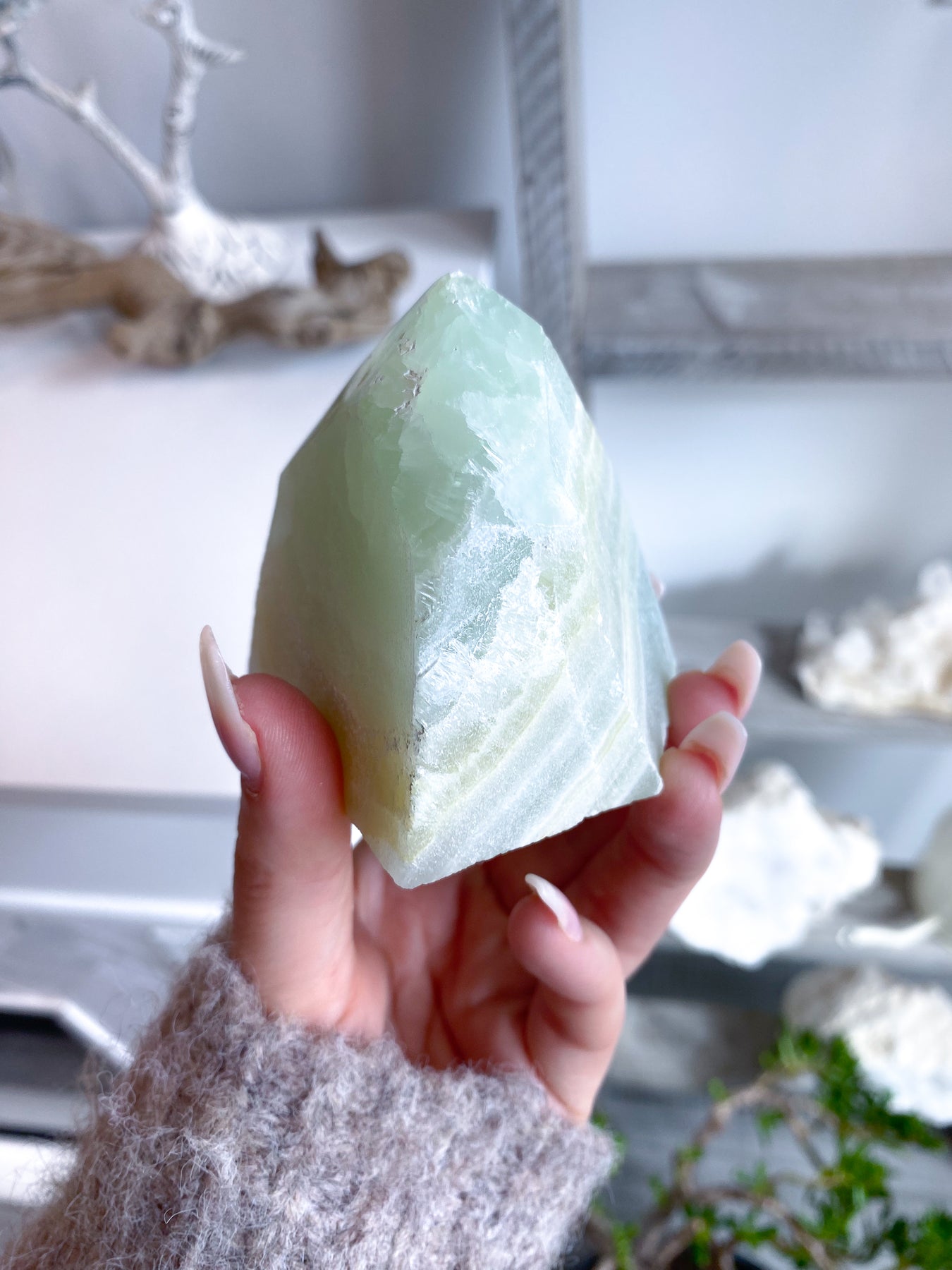 Open your heart chakra center with Sea Green (Pistachio) Calcite, a peaceful gemstone that provides a conduit for insight and appreciation. It is a stone that welcomes our heart's thoughts and teaches us patience. Wisdom and enlightenment come from meditating with green calcite, as it helps us relate to the bigger world around us. There is a lovely and giving energy that comes from this gemstone and it is a natural, cleansing energy that is great as a soothing balm. Green Pistachio Calcite facilitates physical healing by clearing negative emotions & encouraging relaxation. This stones green vibration opens your sacred heart to receive love from the spiritual realm & encourages tolerance, compassion, and understanding.