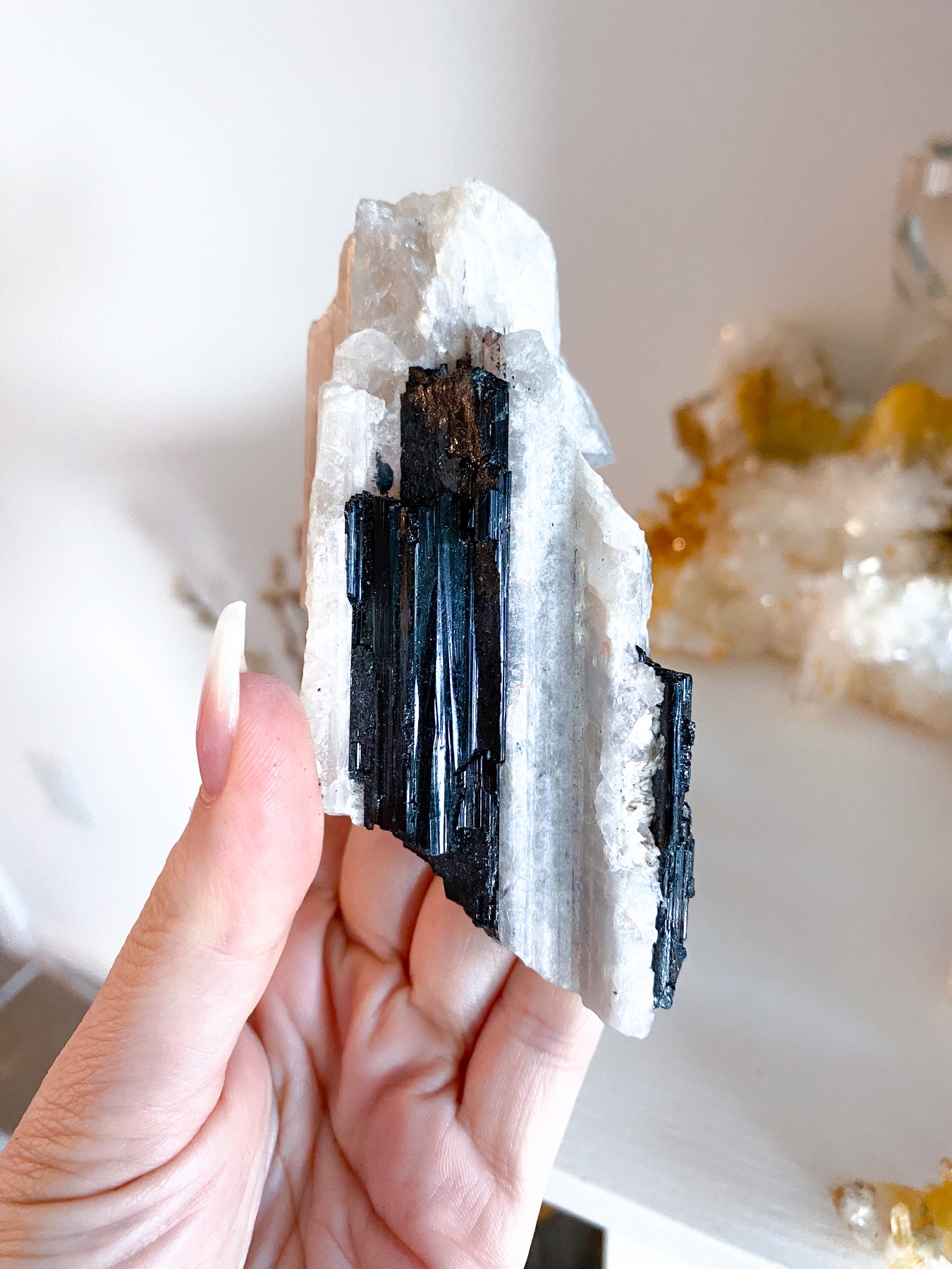 The inky, beautiful Black Tourmaline creates a field of protection by absorbing negativity, cleansing your auric field of harmful energies directed at you. Because of this, the stone aids self-confidence, diminishes fear, enhances energy, promotes internal peace and removes blockages. It also balances male/female, yin/yang energy within the body, including the right-left sides of the brain. Black Tourmaline provides grounding and can assist in swapping bad habits for positive ones. Tourmaline has many colors, but the darker than night black variety gets its color from the iron it contains.