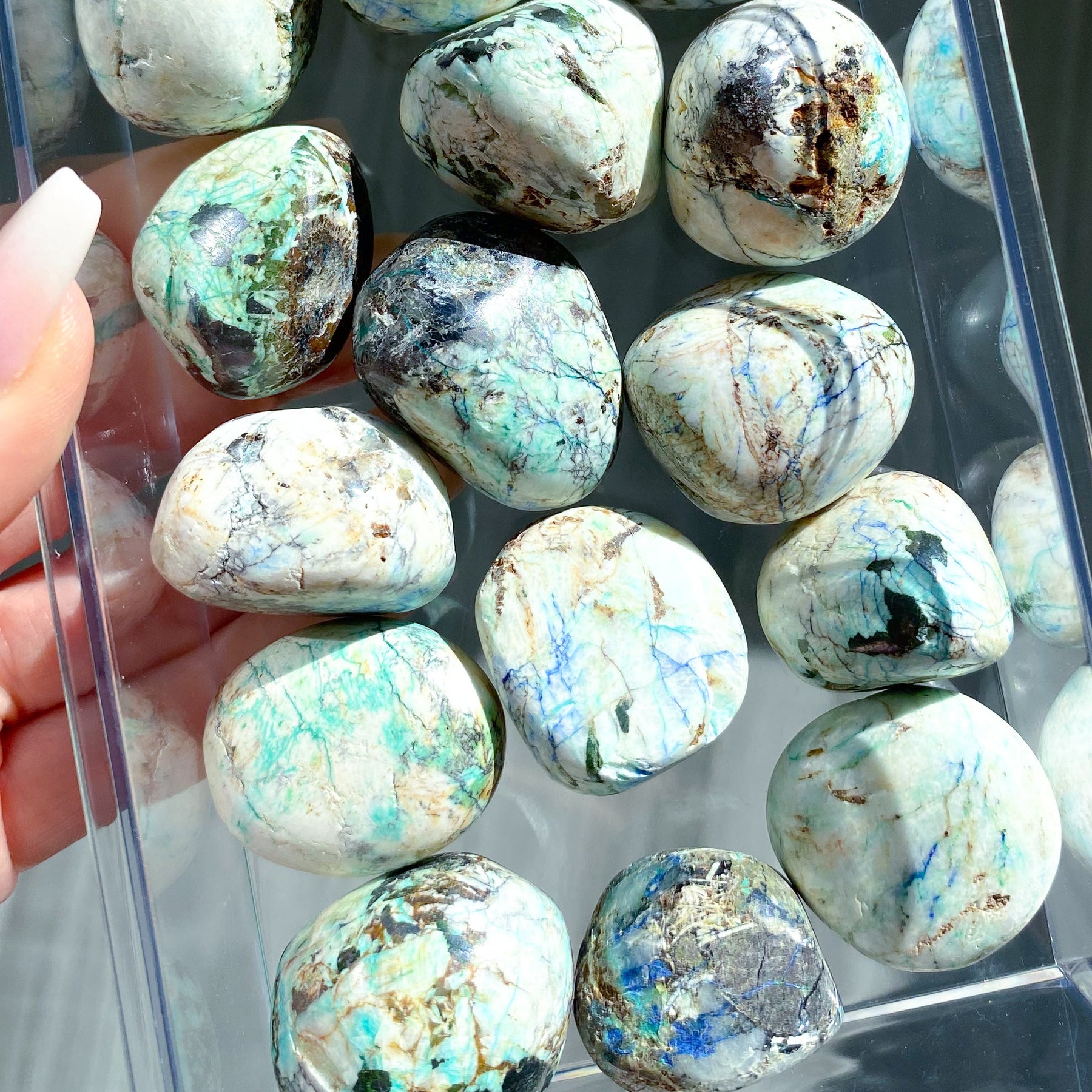 Azurite Malachite freshens our outlook on life, by combining the transformative power of Malachite and healing power of Azurite. This power-duo works especially well to dissolve egocentric characteristics such as conceit, arrogance and vanity, qualities that are often a product of trauma. By calming anxiety and promoting openness, love and compassion, it releases unneeded inhibitions and enhances our empathy while it softens often cold intellectualism. By opening our heart to unconditional love, Azurite Malachite can stimulate vivid dreams and allow you to absorb and process new ideas you never thought were possible. Azurite Malachite is a soft stone and its surface can be easily damaged. Sensitive to heat and sun-bleaching, store it in darker places and do not put on windowsills.