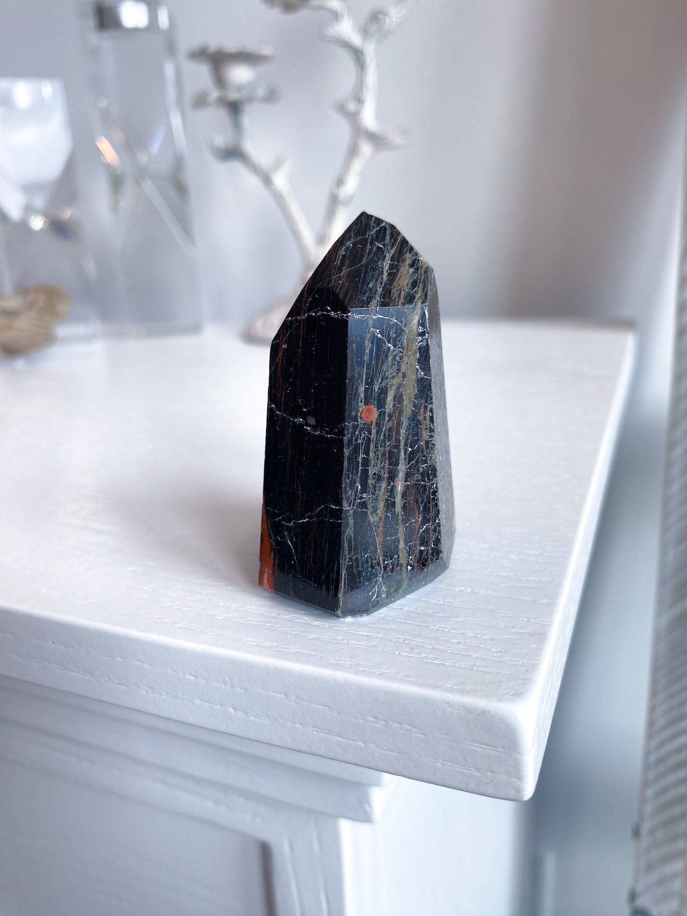 The inky, beautiful Black Tourmaline creates a field of protection by absorbing negativity, cleansing your auric field of harmful energies directed at you. Because of this, the stone aids self-confidence, diminishes fear, enhances energy, promotes internal peace and removes blockages. It also balances male/female, yin/yang energy within the body, including the right-left sides of the brain. Black Tourmaline provides grounding and can assist in swapping bad habits for positive ones. Tourmaline has many colors, but the darker than night black variety gets its color from the iron it contains.