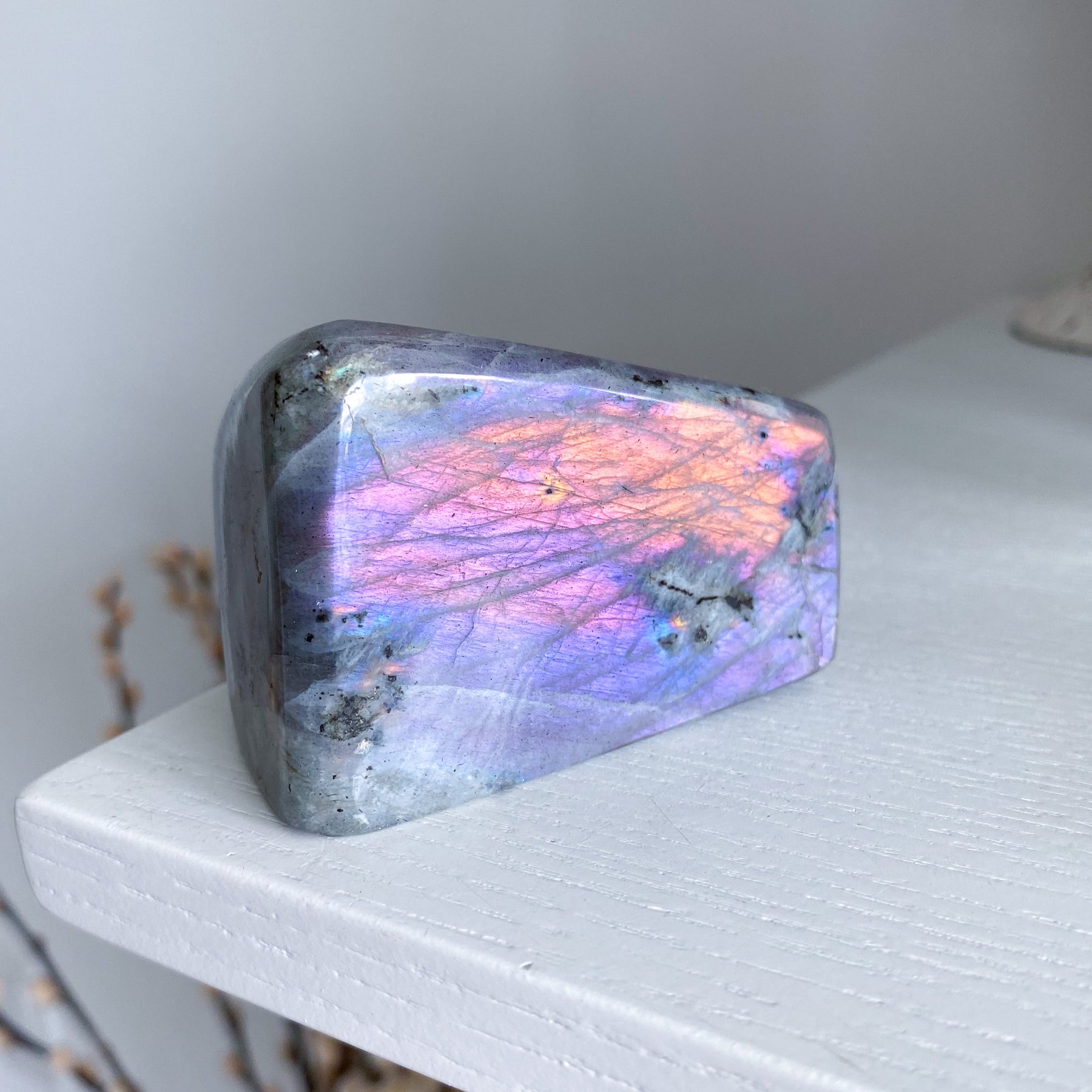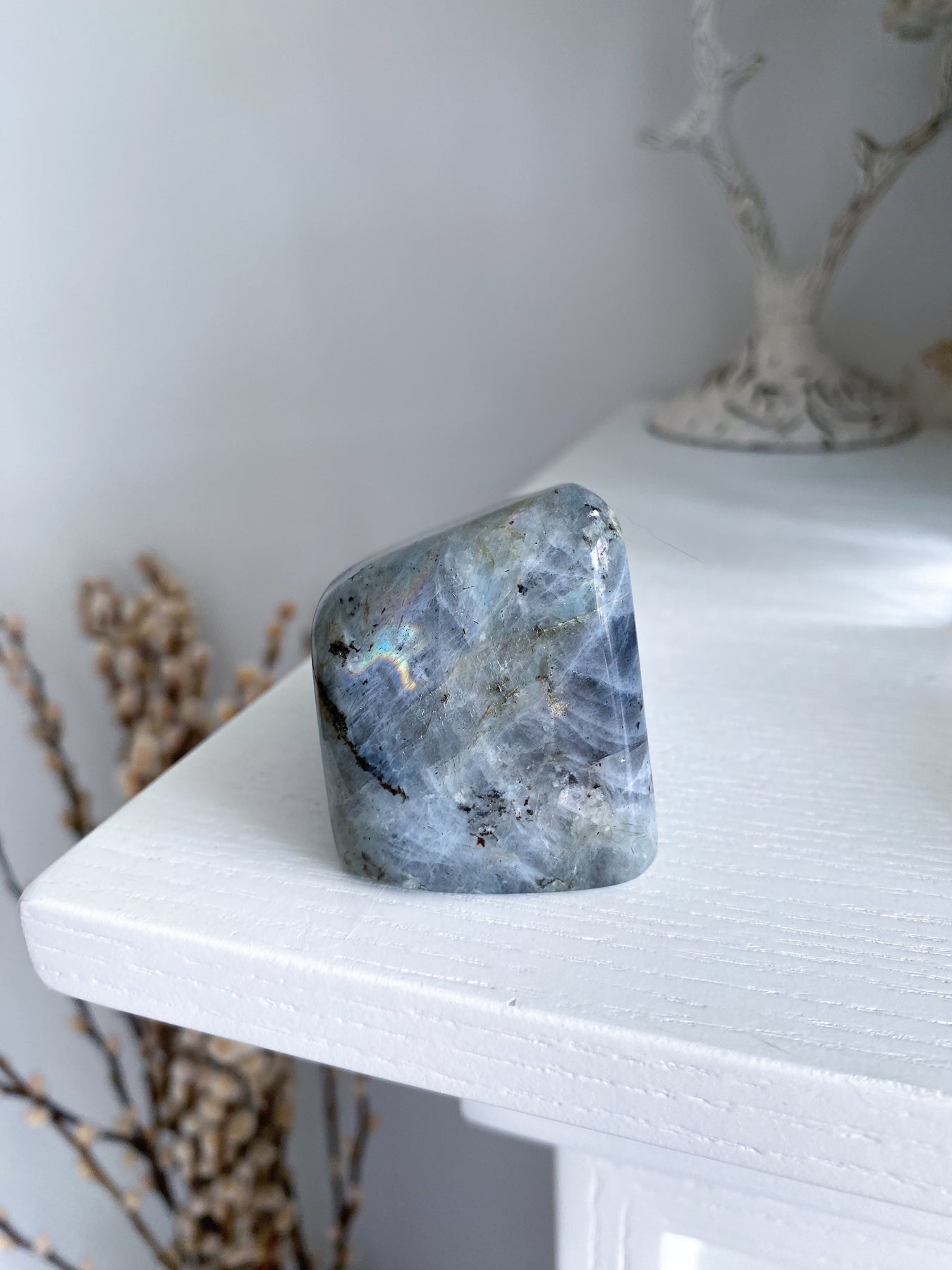 Labradorite’s transformative powers support us during times of change and personal evolution. Labradorite helps soothe fear, release insecurity, calm the mind, and promote strength and perseverance. It can lift your mood, strengthen intuition, and even balance and protect your aura. Working with this stone will enhance your psychic abilities by elevating your intuition, raising your consciousness and deepening your connection to spiritual energies. A gateway to new ideas, Labradorite stimulates imagination and is known to reveal the truth behind illusions. Because of these benefits, this iridescent stone truly builds trust in the self and in the Universe.