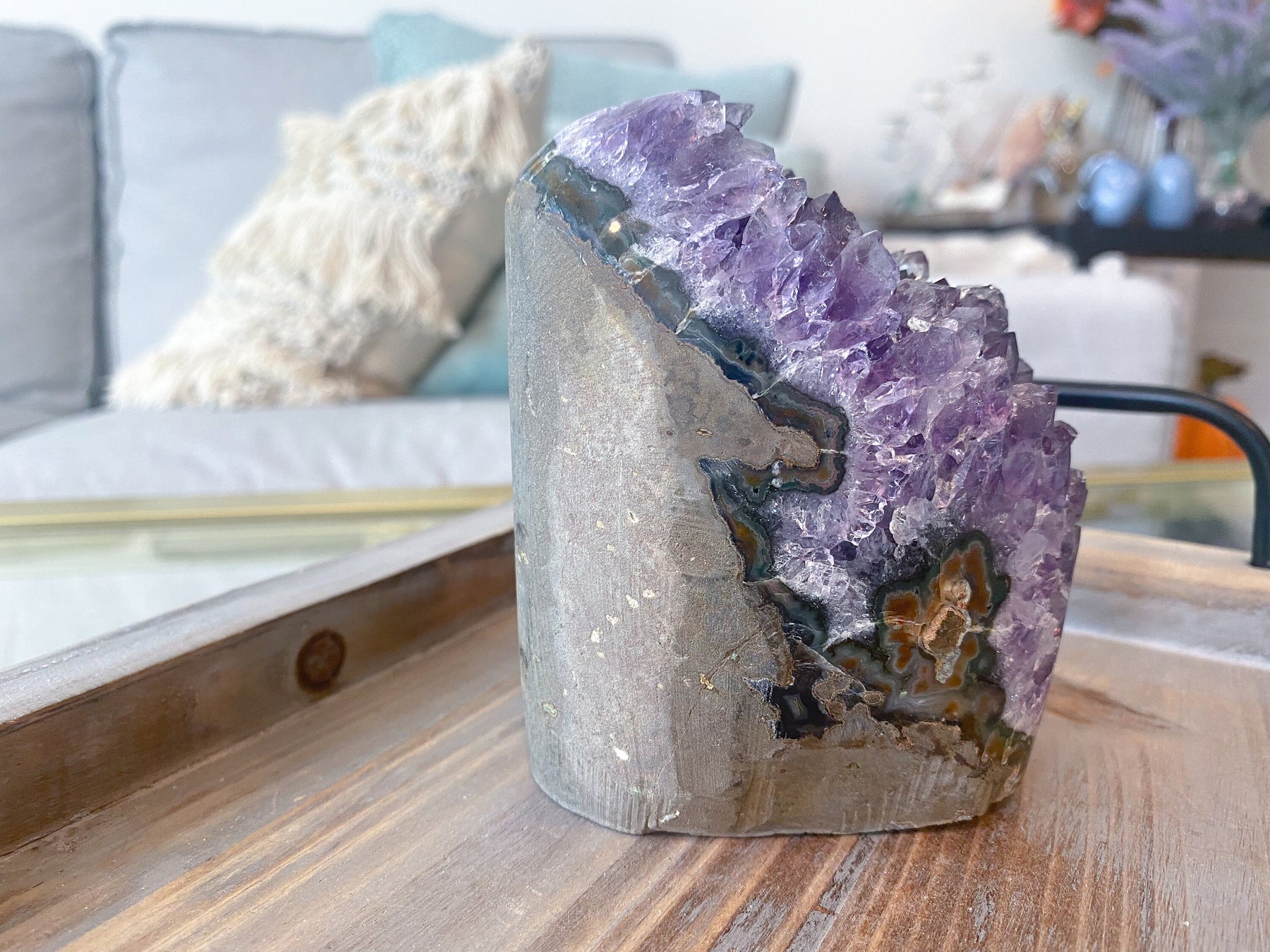 Amethyst’s popularity is well deserved, as it is a beautiful, protective stone with healing, cleansing and calming powers that dissolve negative energy and aid our auras. Amethyst activates spiritual awareness, opens intuition, and enhances psychic abilities. Able to relieve physical, emotional and psychological stress, it can help ease headaches and tension. Both calming and stimulating, this talisman of success assists in memory, creativity, and motivation that ultimately creates focus and drive. It can relieve insomnia and barricade against lower energies, unhealthy environments and ill-will from others. The stone encourages selflessness, spiritual wisdom, clarity and peace both awake and asleep. Variations of Amethyst such as Chevron have the added benefit of increasing a meditative state, aiding manifestation efforts and relieving resistance to change.
