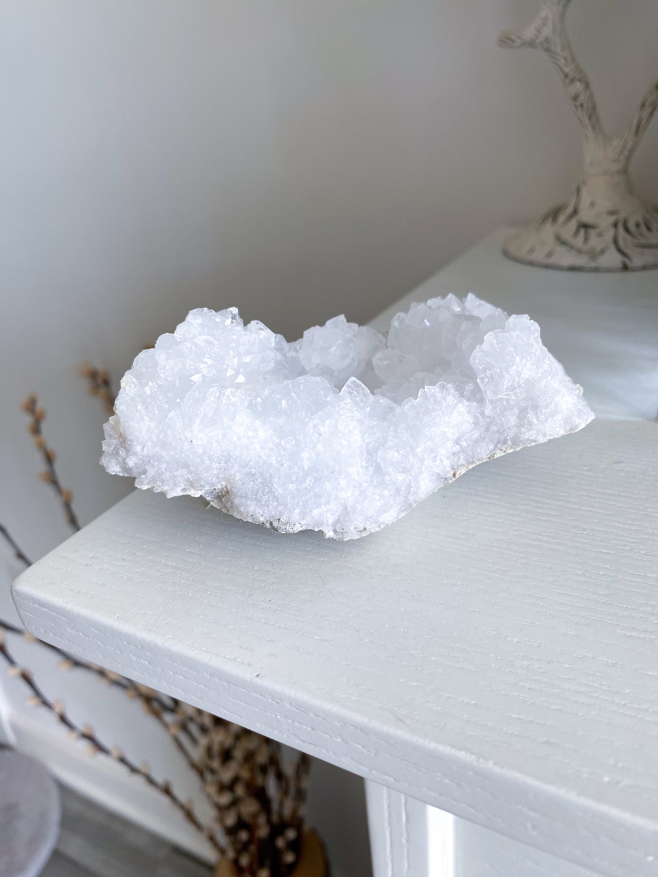 White Calcite amplifies and cleanses energy from the environment. White Calcite restores motivation and accelerates growth and development. White Calcite raises consciousness, links to higher spiritual states and awakens psychic abilities. It absorbs energy and returns it to the sender having transmuted and amplified it. White Calcite cleanses the auric field and chakras, and is the stone of new beginnings.